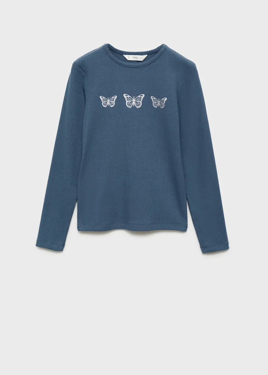 OpisBawełna 100%. Prążkowana tekstura. Nadruk. Wzór w motyle. Okrągły dekolt. Długi rękaw.
