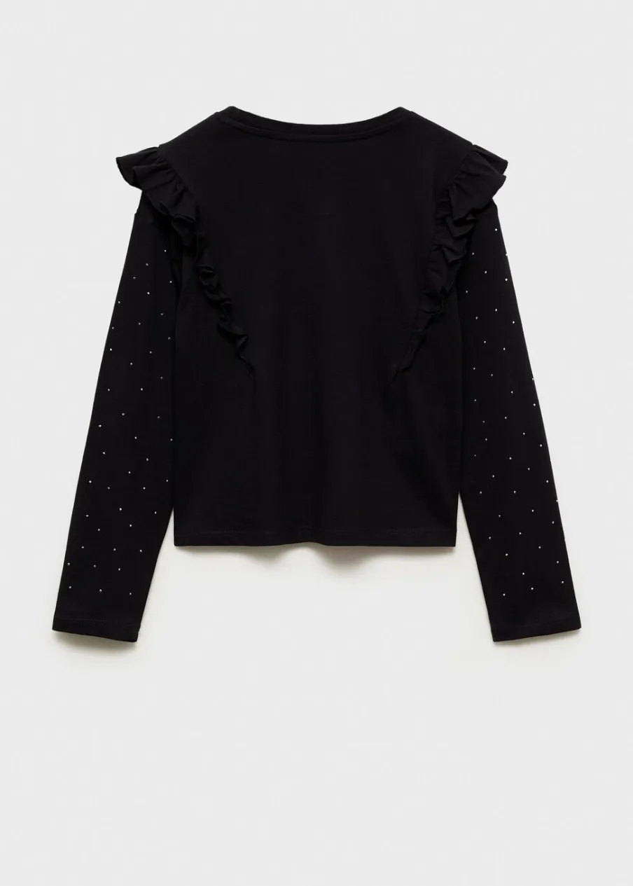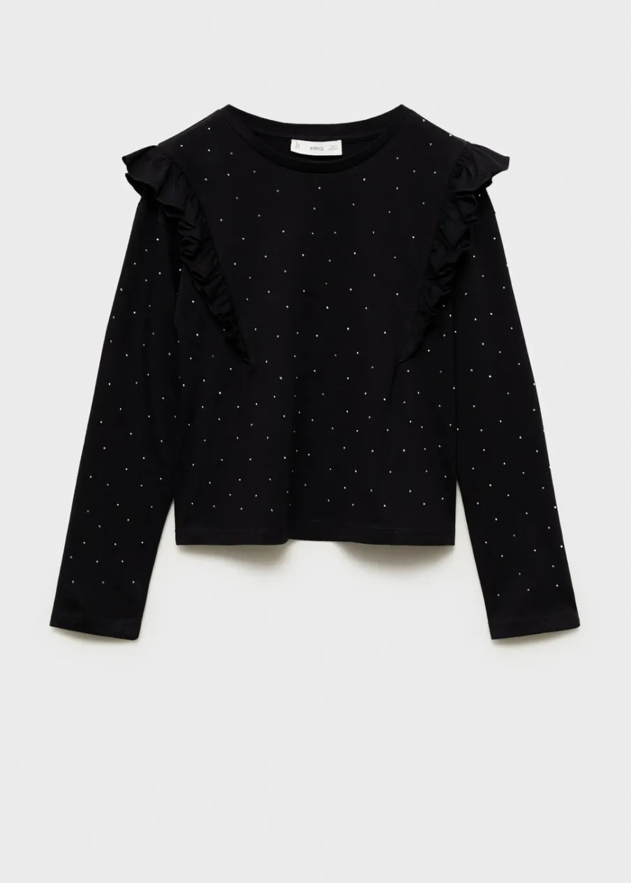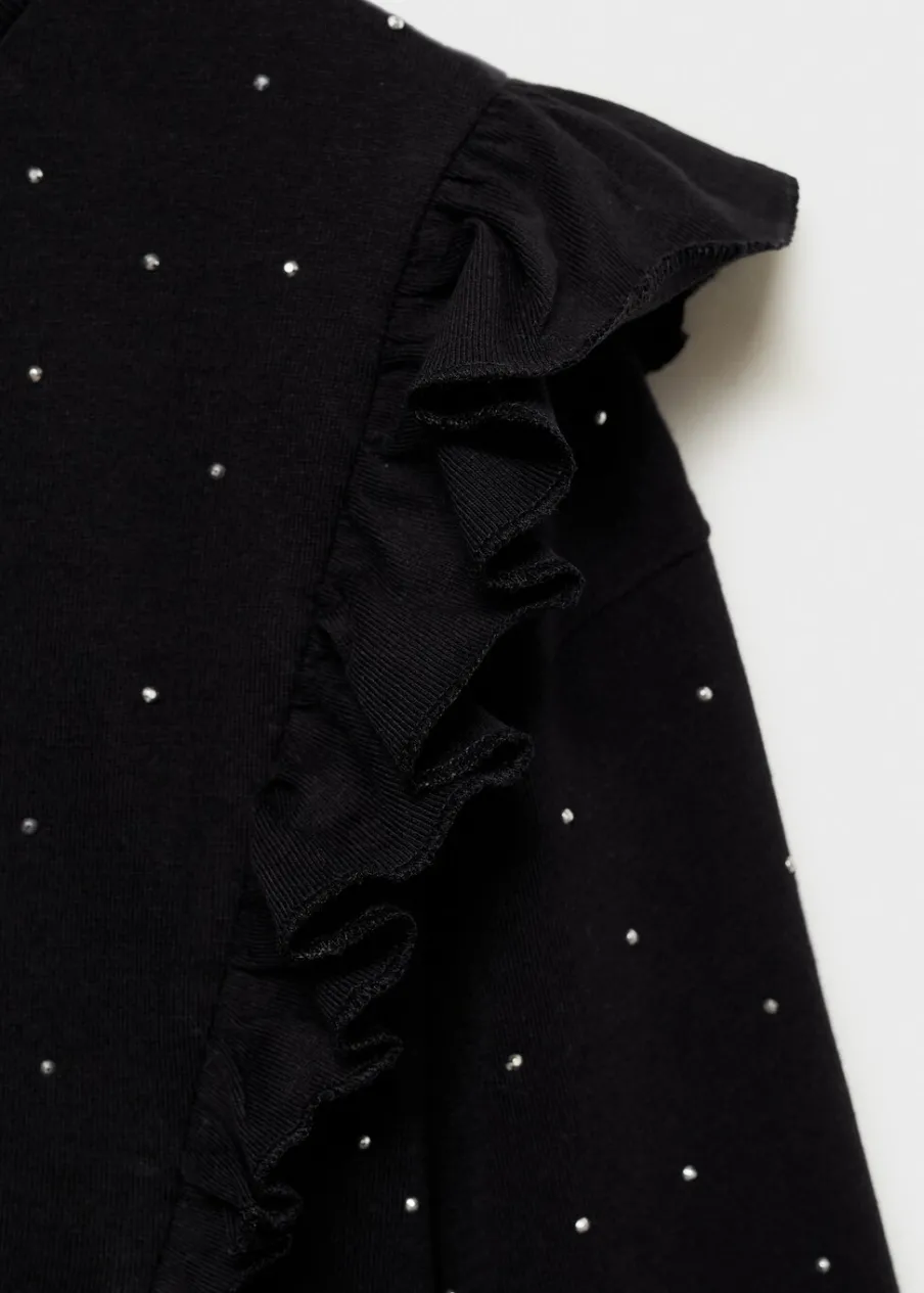 Długi rękaw. Model prosty. Okrągły dekolt. Bawełna 100%. Ozdoba z kryształków strass. Kolekcja wieczorowa i imprezowa. Z falbanami.