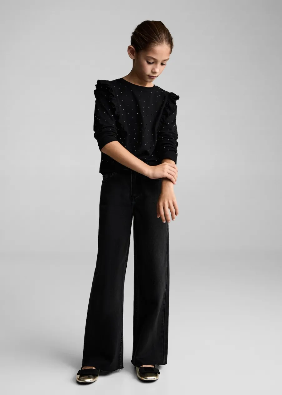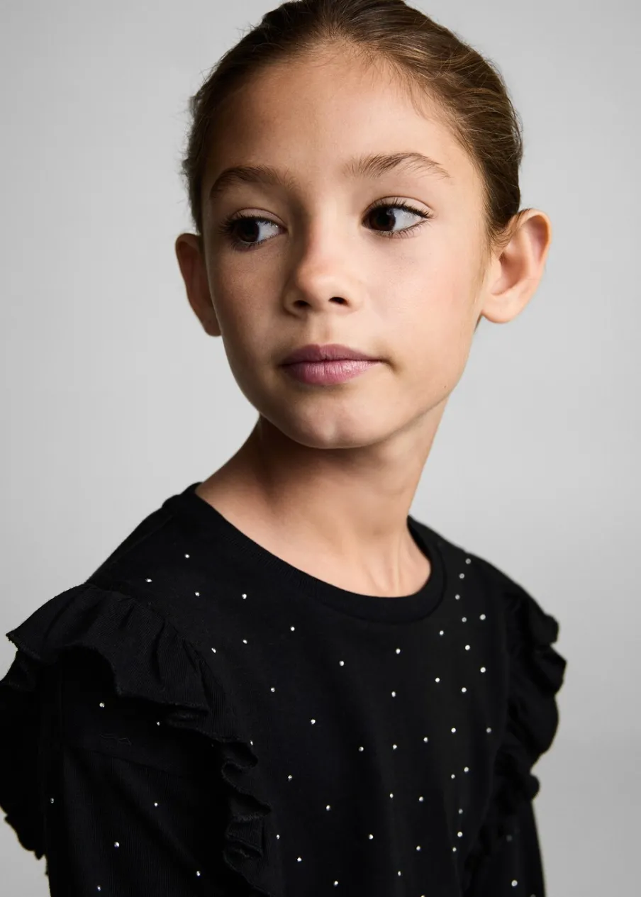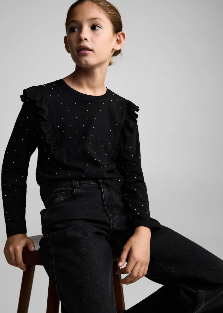 Długi rękaw. Model prosty. Okrągły dekolt. Bawełna 100%. Ozdoba z kryształków strass. Kolekcja wieczorowa i imprezowa. Z falbanami.