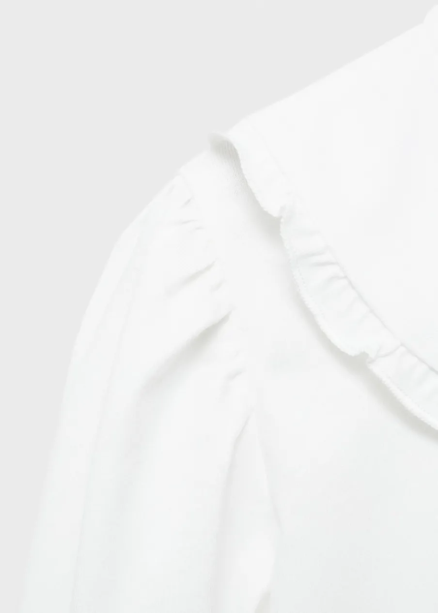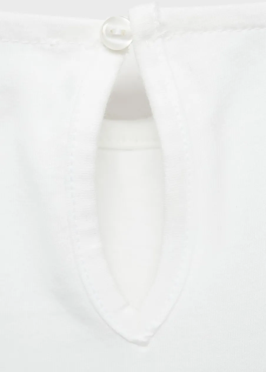 OpisBawełna 100%. Model prosty. Kołnierzyk bebe. Długi rękaw. Zapięcie na guzik z tyłu.