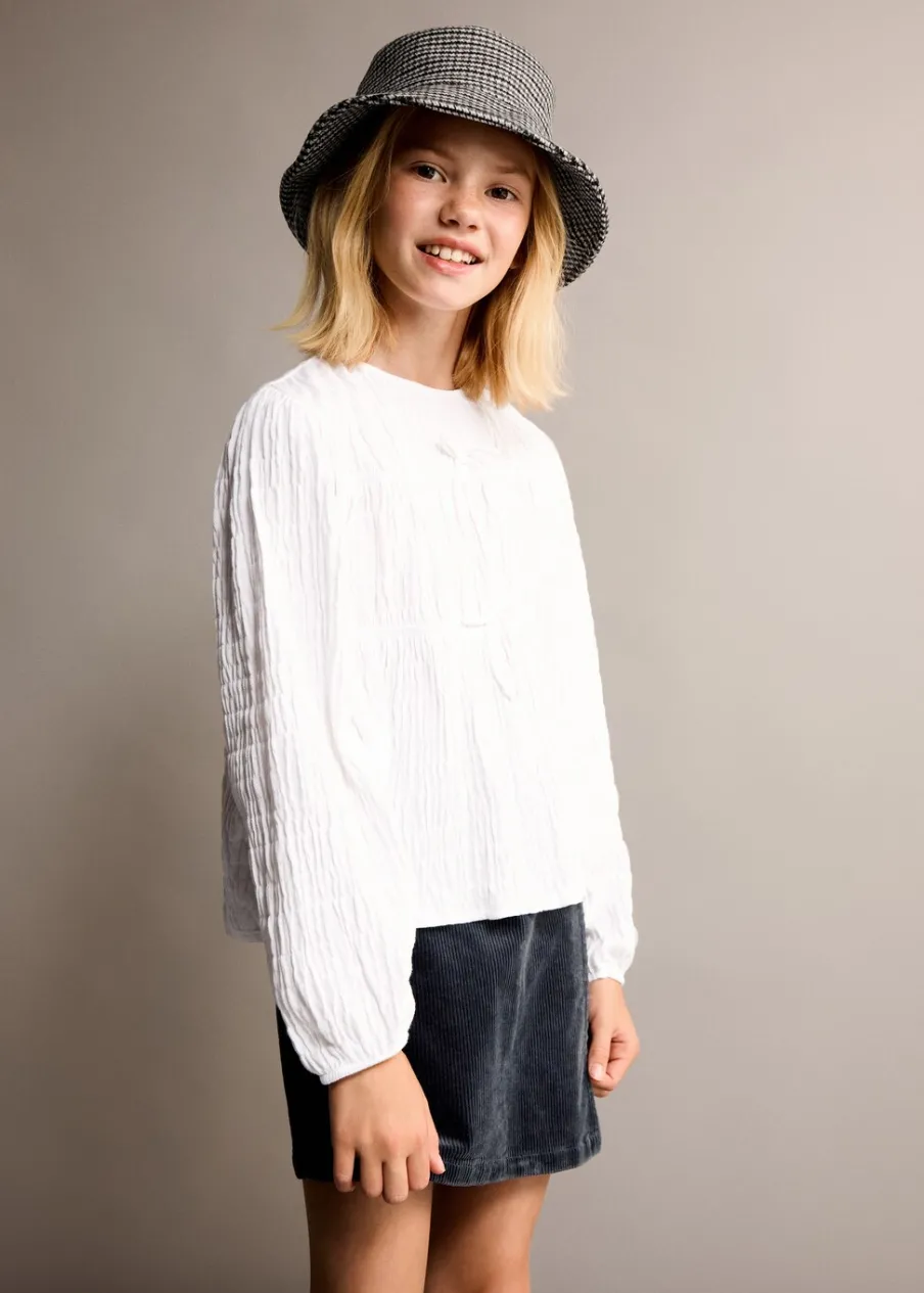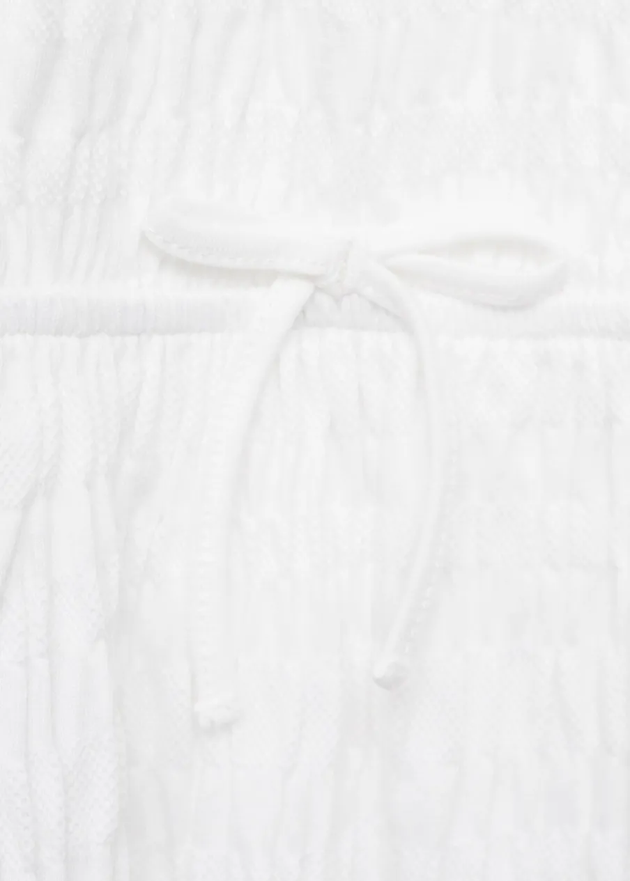 Tkanina z bawełną. Elastyczne marszczenie. Okrągły dekolt. Długi rękaw. Ozdobne kokardki. Zapięcie z tyłu w kształcie łezki.