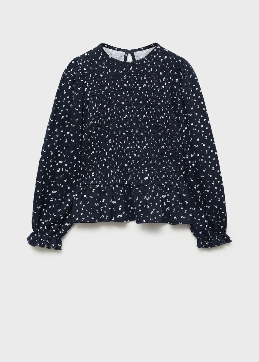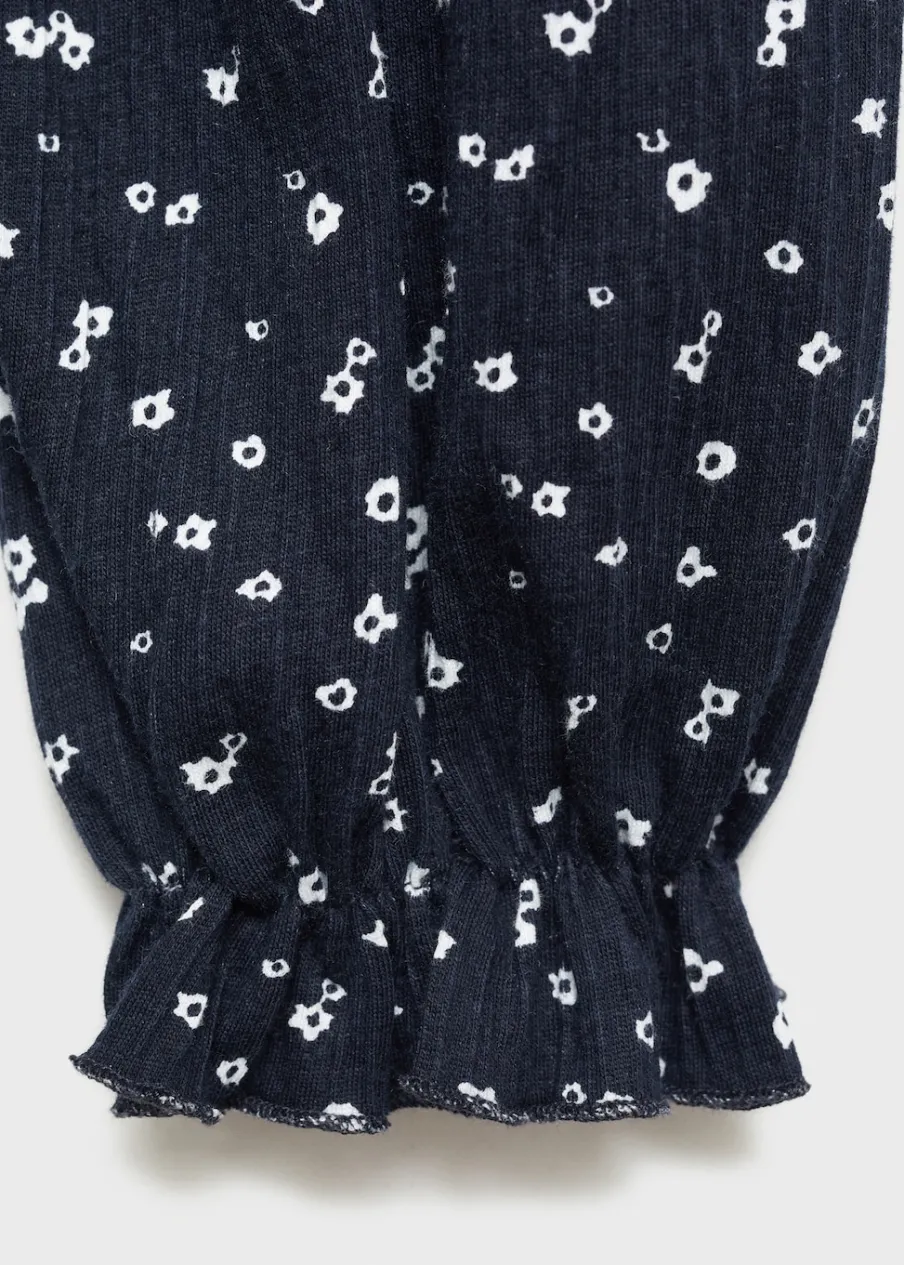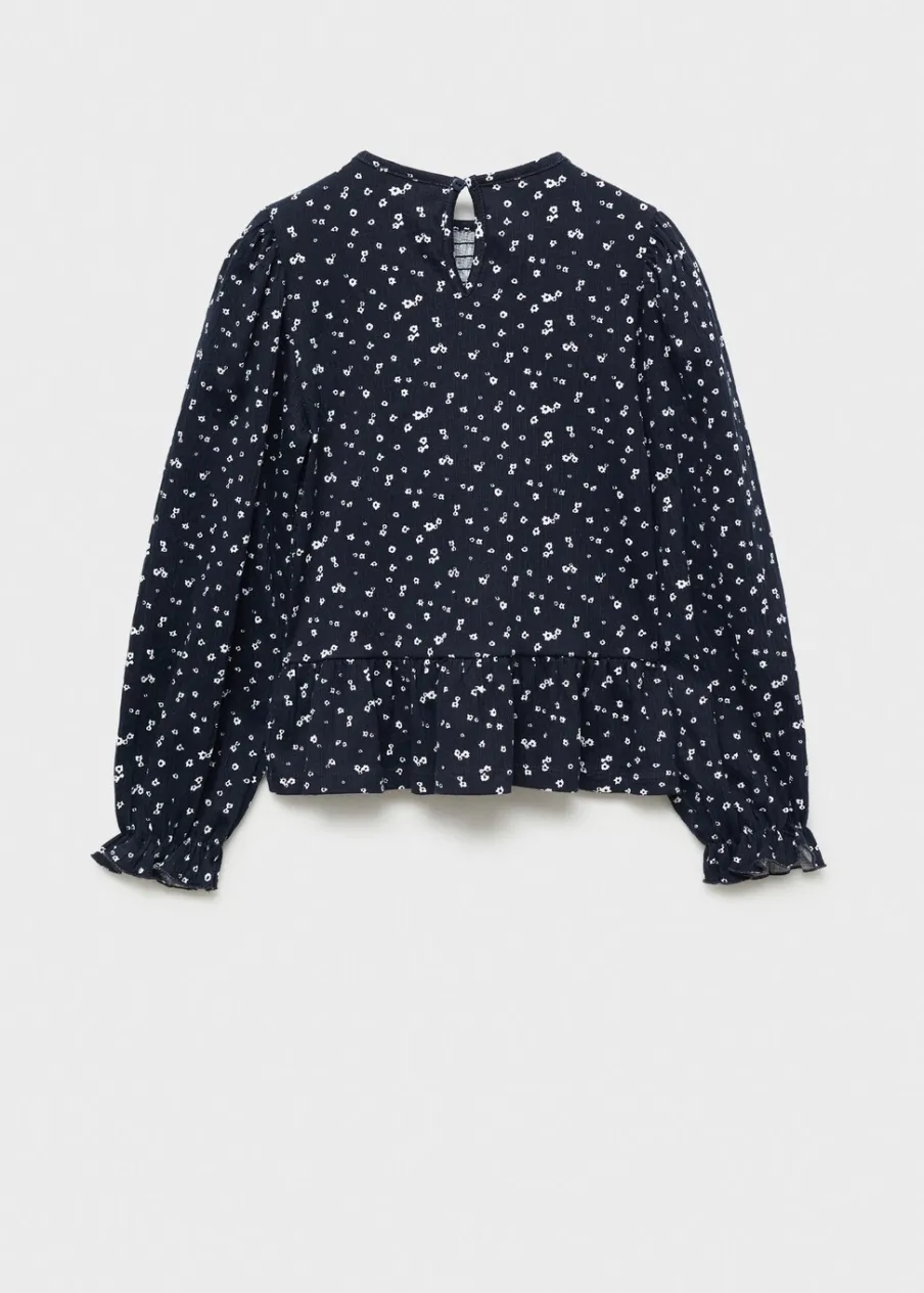 Model prosty. Nadruk. Okrągły dekolt. Długi rękaw z falbanką. Zapięcie z tyłu w kształcie łezki.