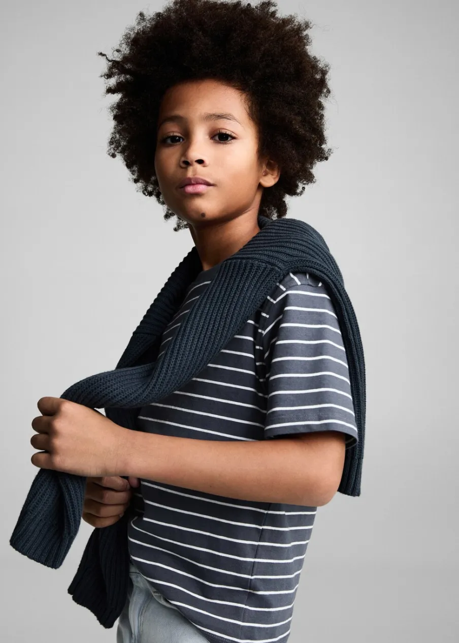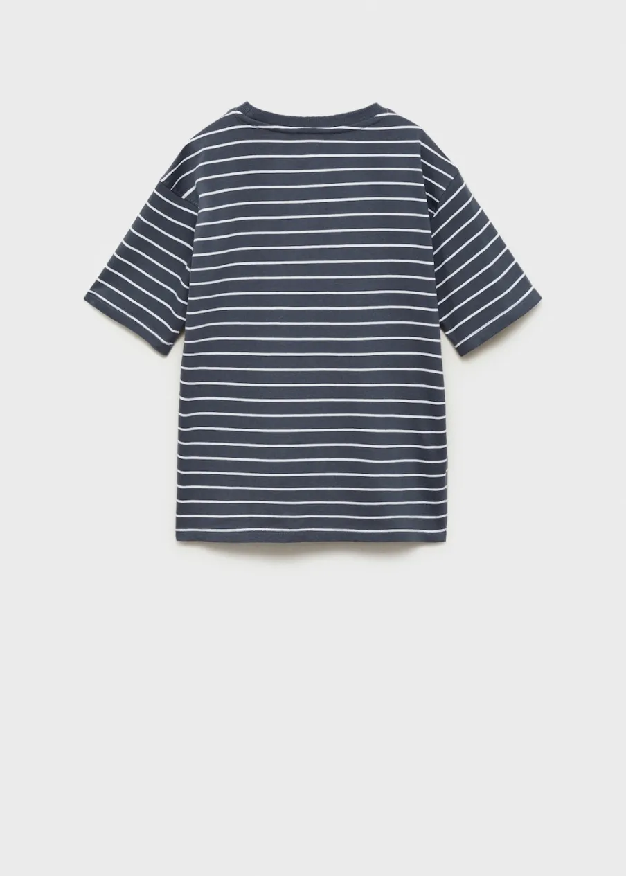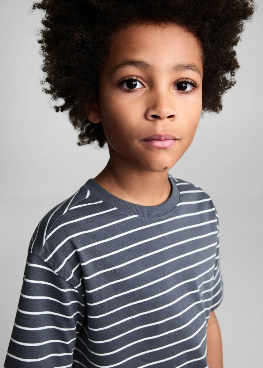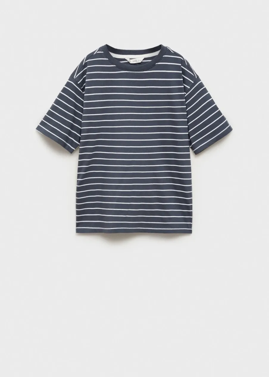 Tkanina z 100% bawełny. Dzianina. Deseń w pasy. Model prosty. Okrągły dekolt. Krótki rękaw.