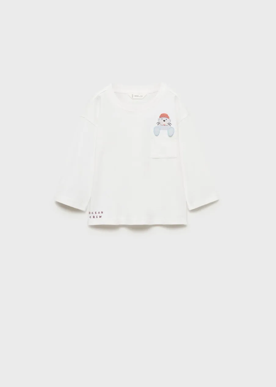 Bawełna 100%. Model prosty. Haftowany detal. Nadruk zwierzęcia. Okrągły dekolt. Kieszeń nakładana. Długi rękaw.