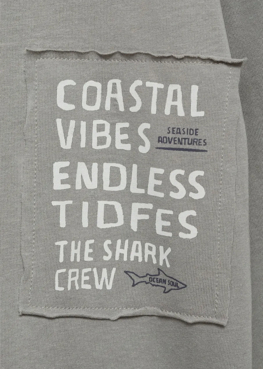 Kolekcja Powrót do szkoły. Bawełna 100%. Model prosty. Nadruk w rekiny. Kolor z efektem sprania. Okrągły dekolt. Długi rękaw.