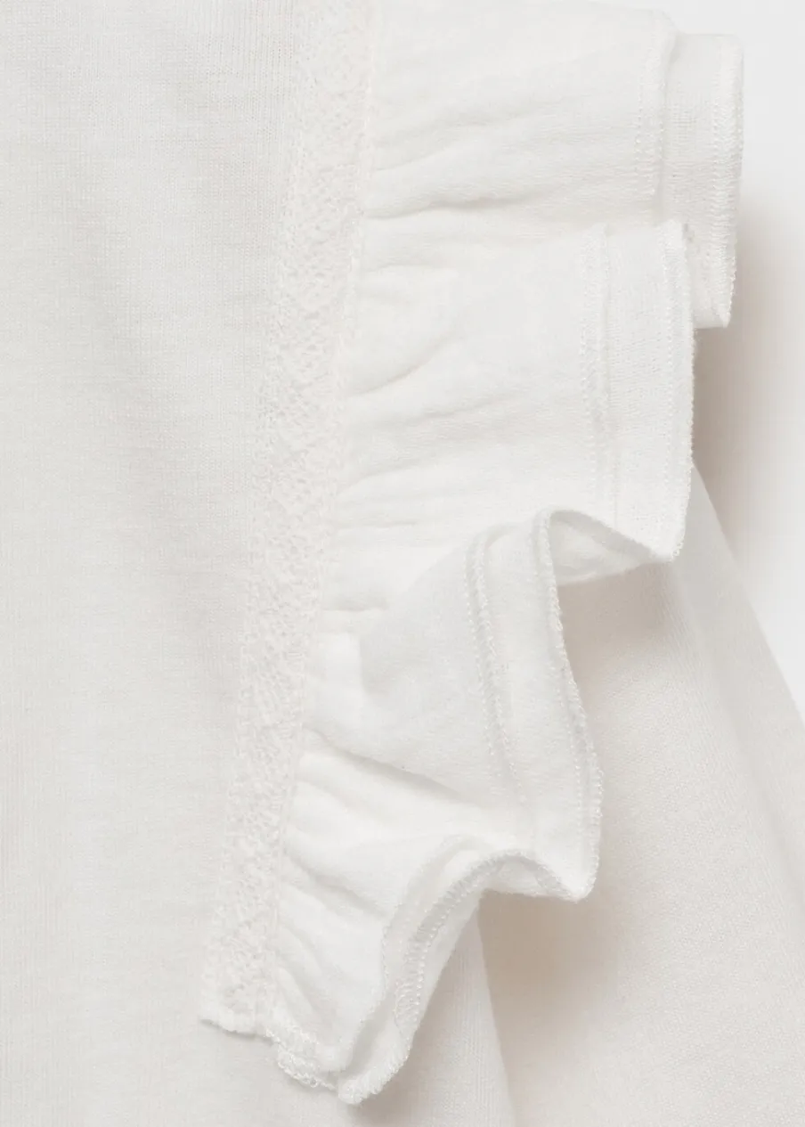 Bawełna 100%. Długi rękaw. Falbanki na ramionach. Okrągły dekolt z zapięciem na guzik.