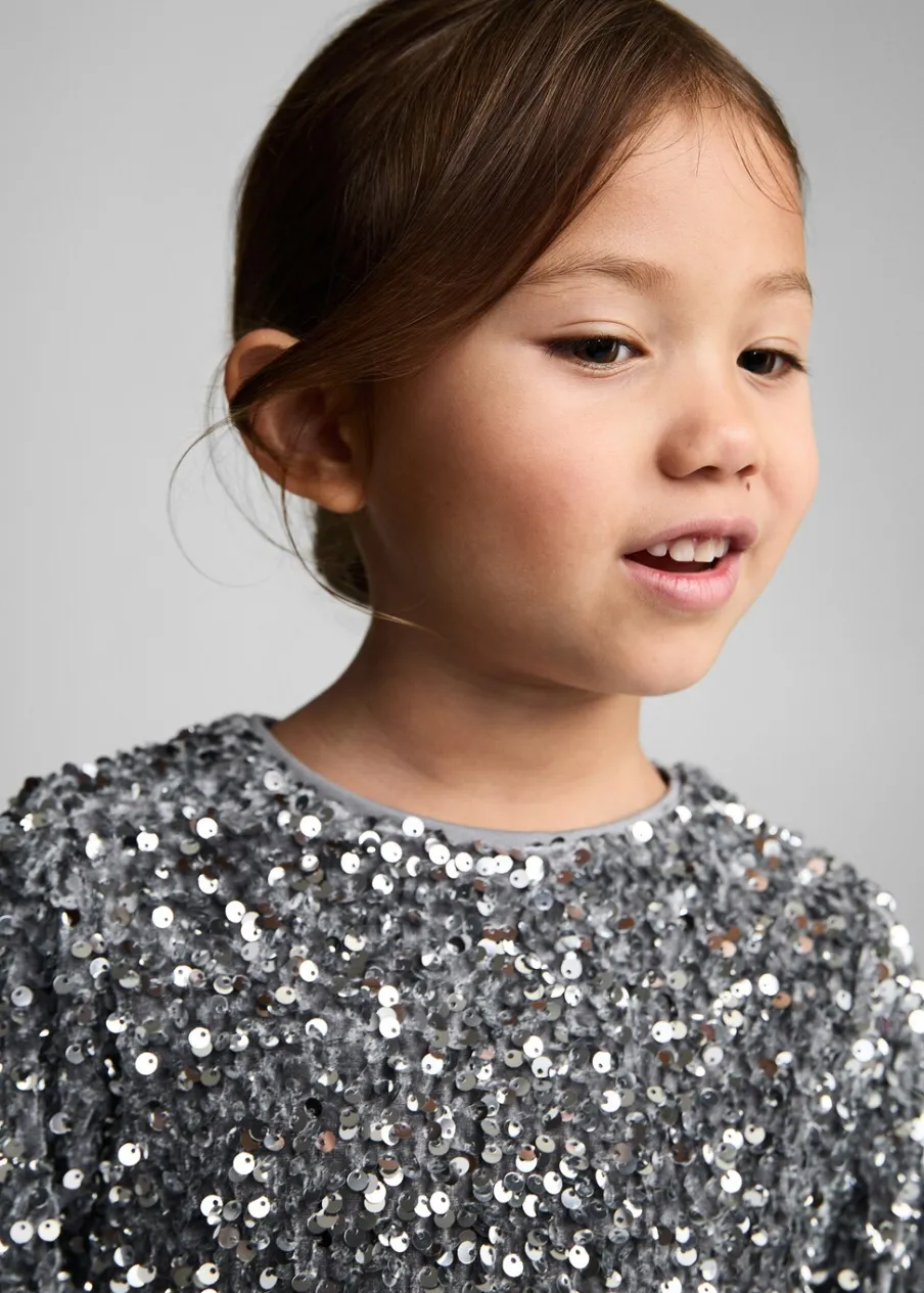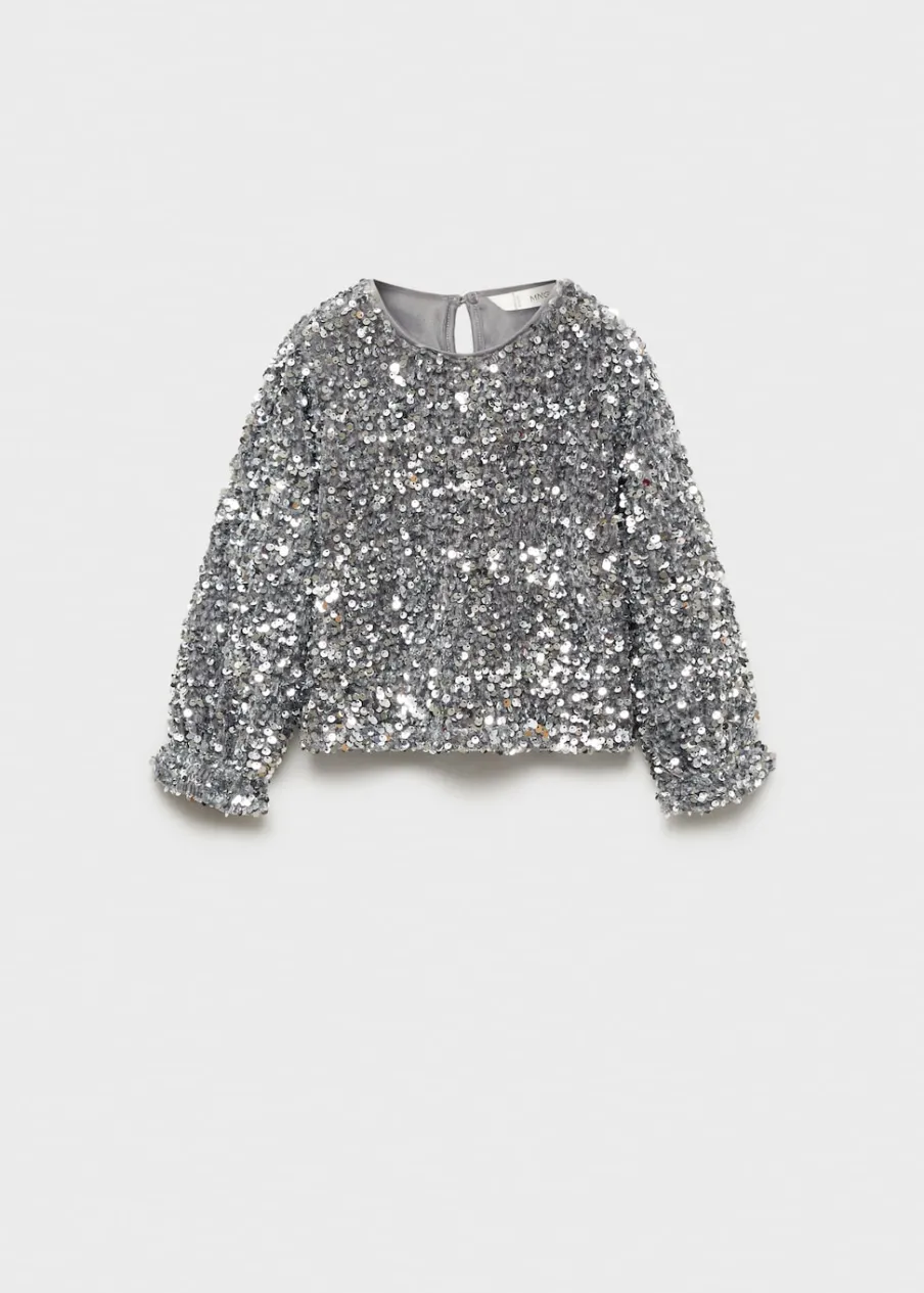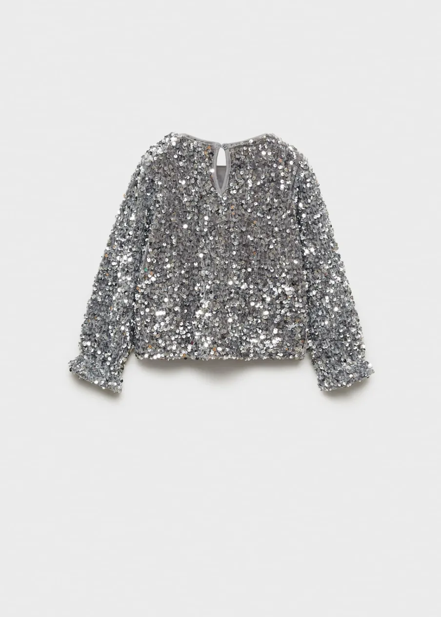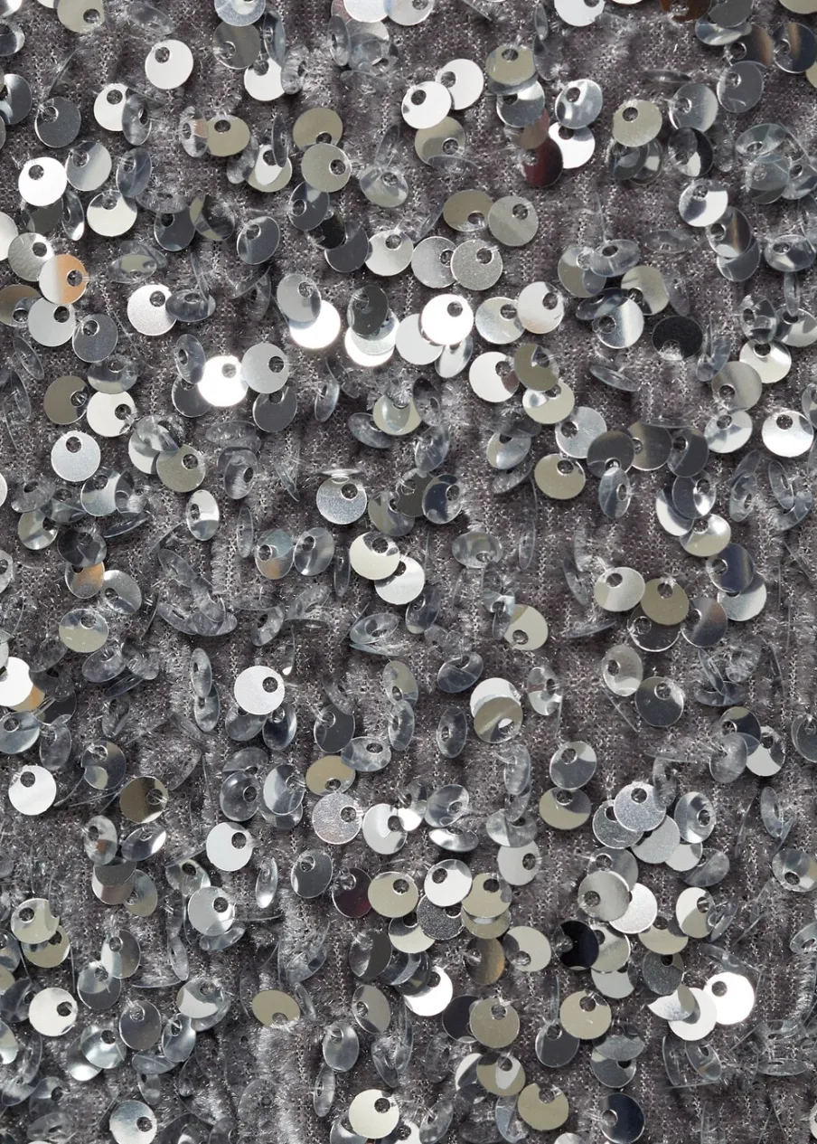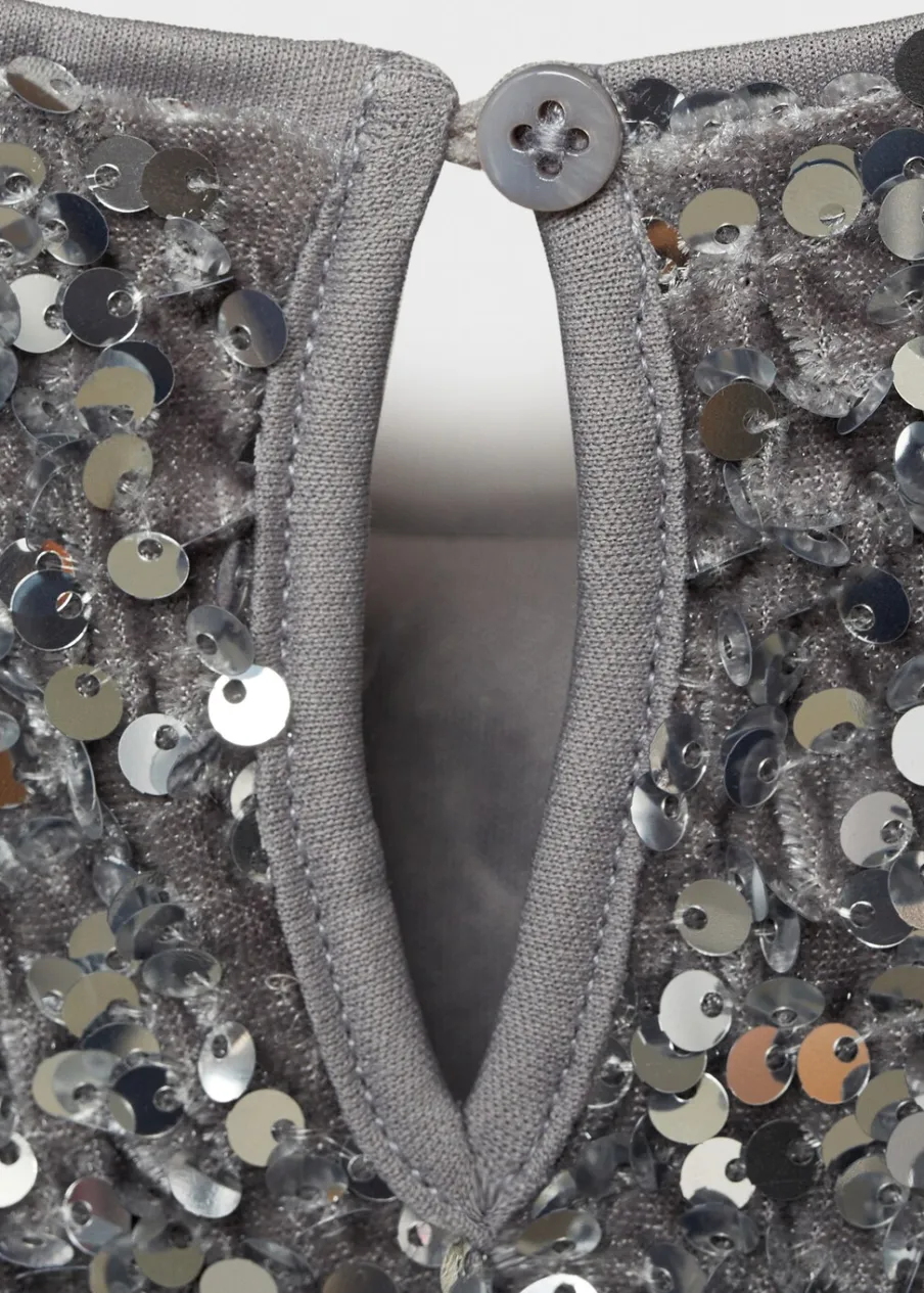 OpisModel prosty. Cekinowa ozdoba. Okrągły dekolt. Długi rękaw. Zapięcie na guzik.