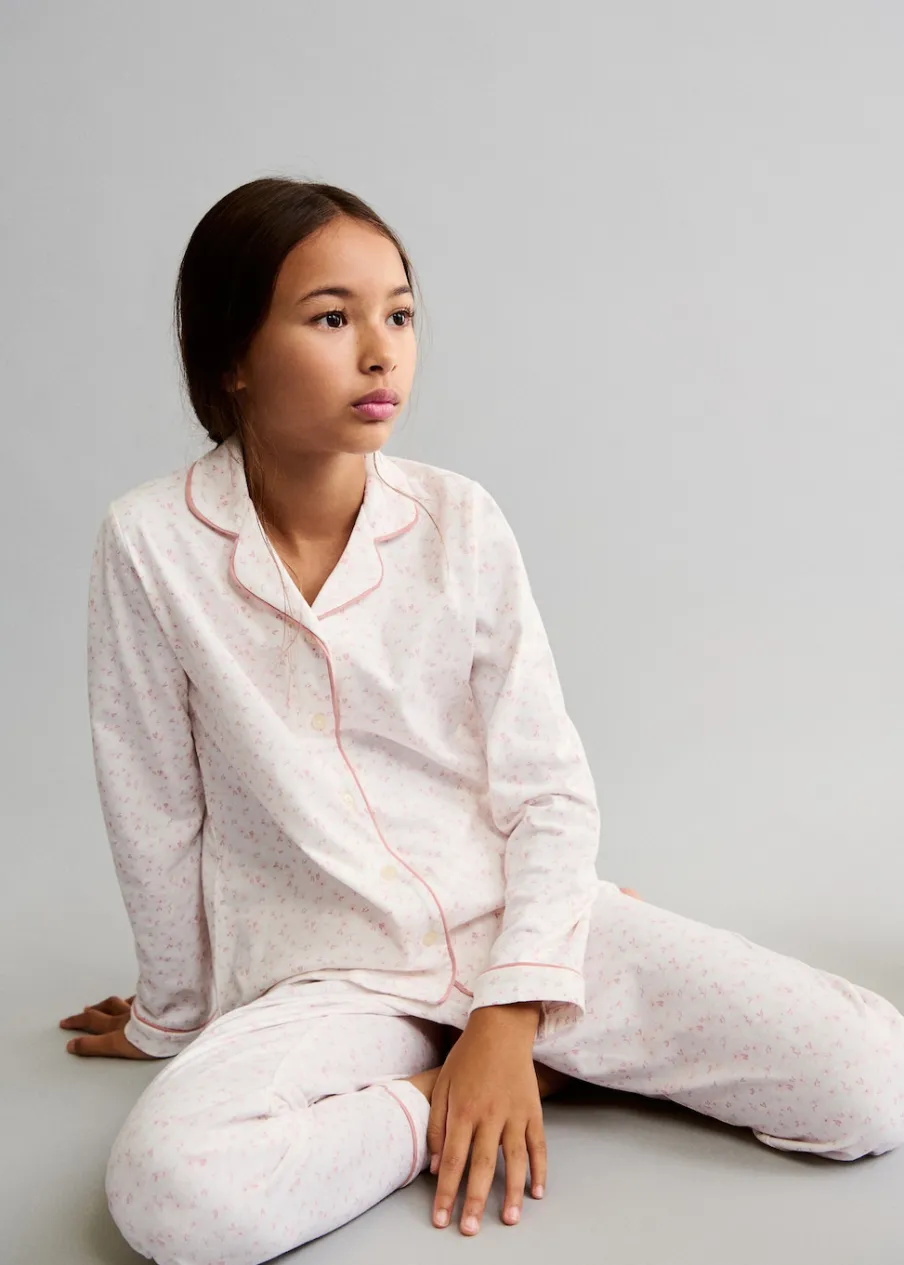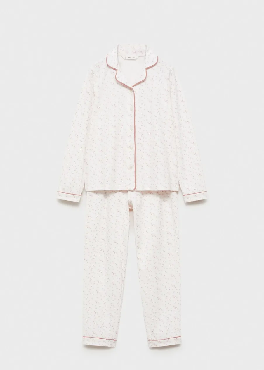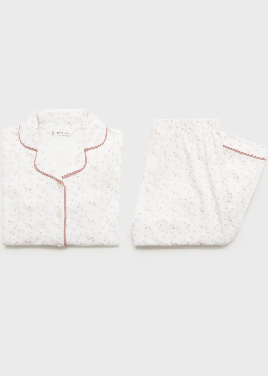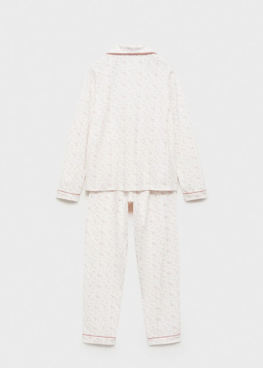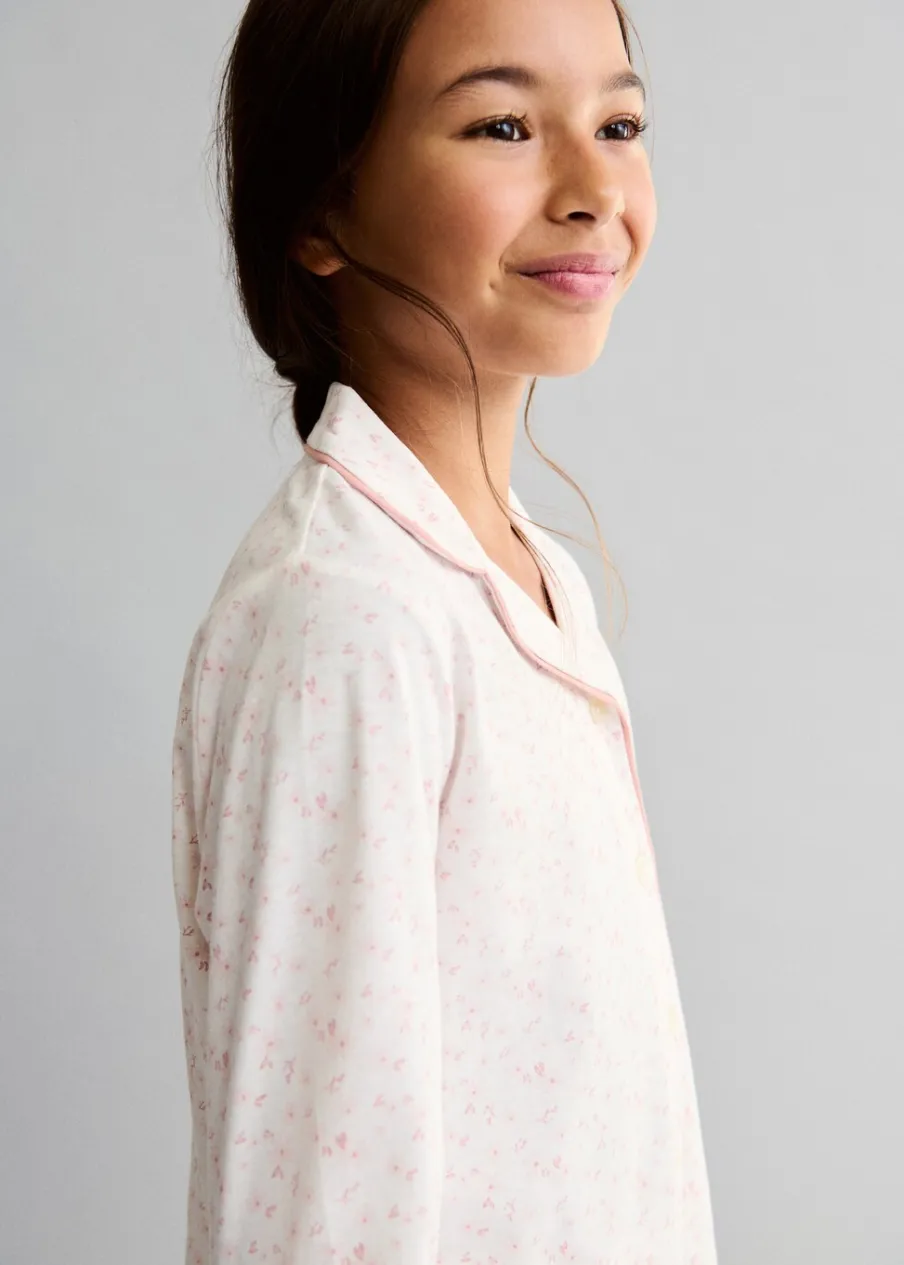 Zestaw piżamowy: koszulka i spodnie. 100% bomull. Kwiatowy wzór. Model długi. Model prosty. Koszulowy kołnierz. Długi rękaw. Elastyczny pas. Zapięcie na guziki.