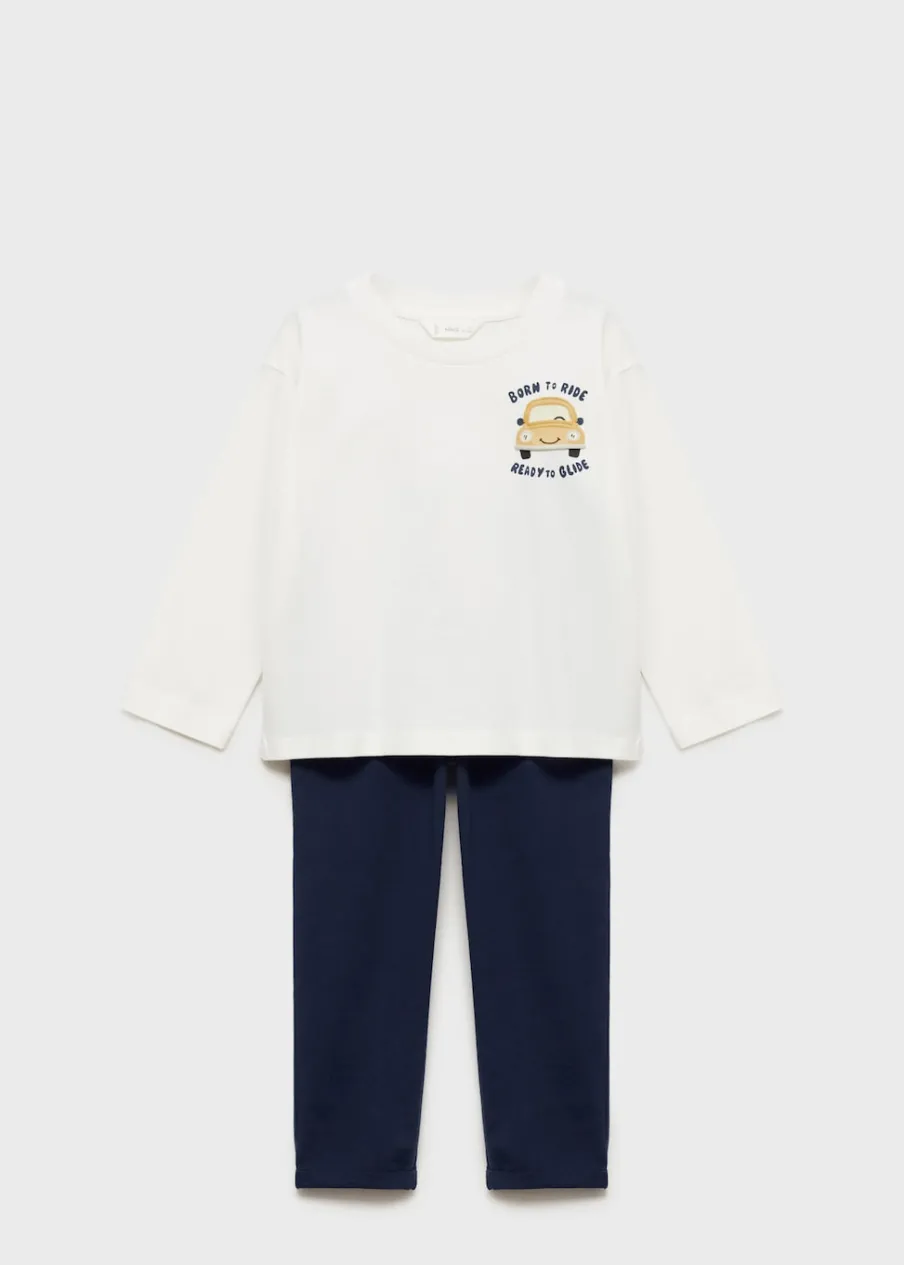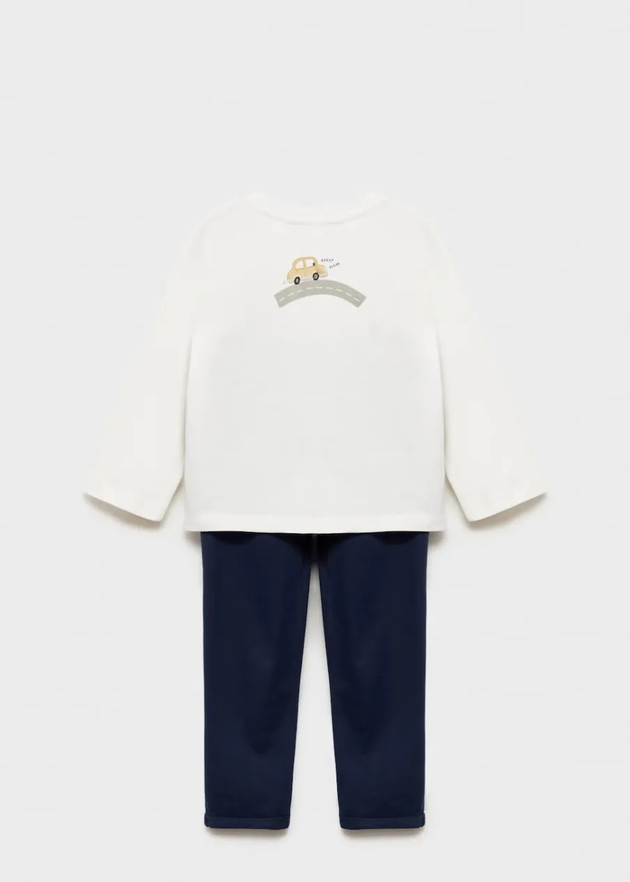 100% bomull. Zestaw piżamowy: koszulka i spodnie. Model prosty. Model długi. Nadruk z samochodem. Długi rękaw. Zapięcie ze sznurkiem do regulacji.