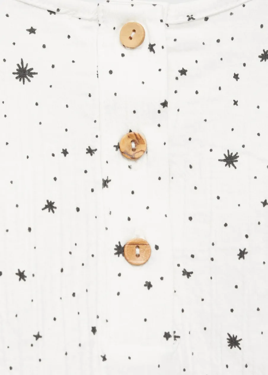 OpisTkanina z bawełną. Model prosty. Nadruk. Okrągły dekolt. Długi rękaw. Zapięcie z tyłu na guziki. Rozcięcie …