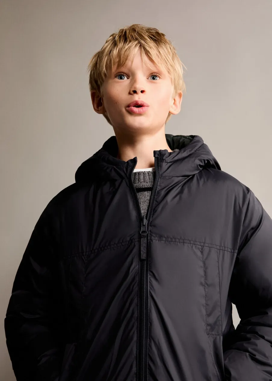 OpisModel dwustronny. Kaptur. Model prosty. Długi rękaw. Model pikowany. Dwie kieszenie boczne. Zapięcie na suwak.