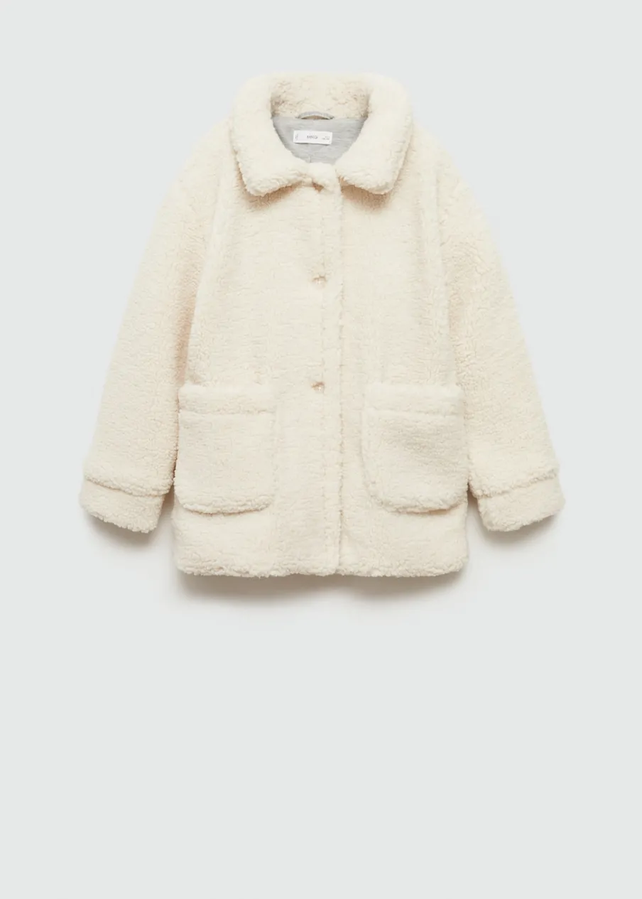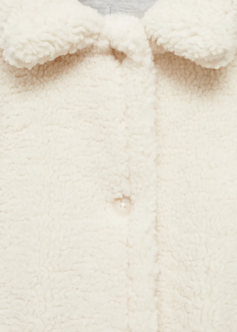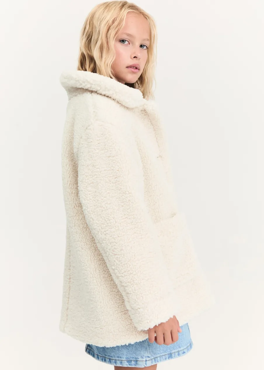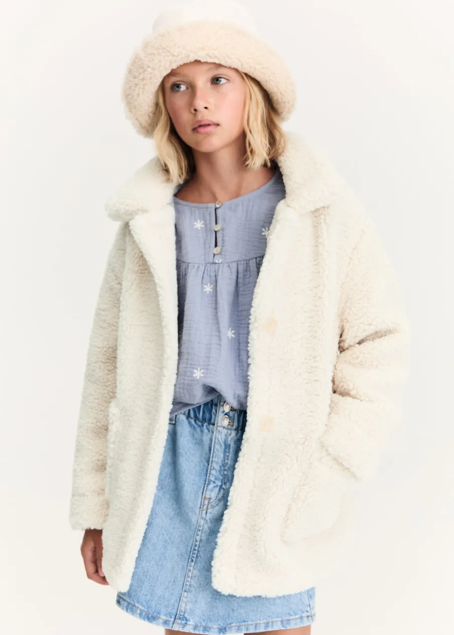 Kolekcja Powrót do szkoły. Tkanina z bawełną. Materiał typu baranek. Model prosty. Model długi. Dwie kieszenie nakładane po bokach. Koszulowy kołnierz. Zapięcie na guziki.