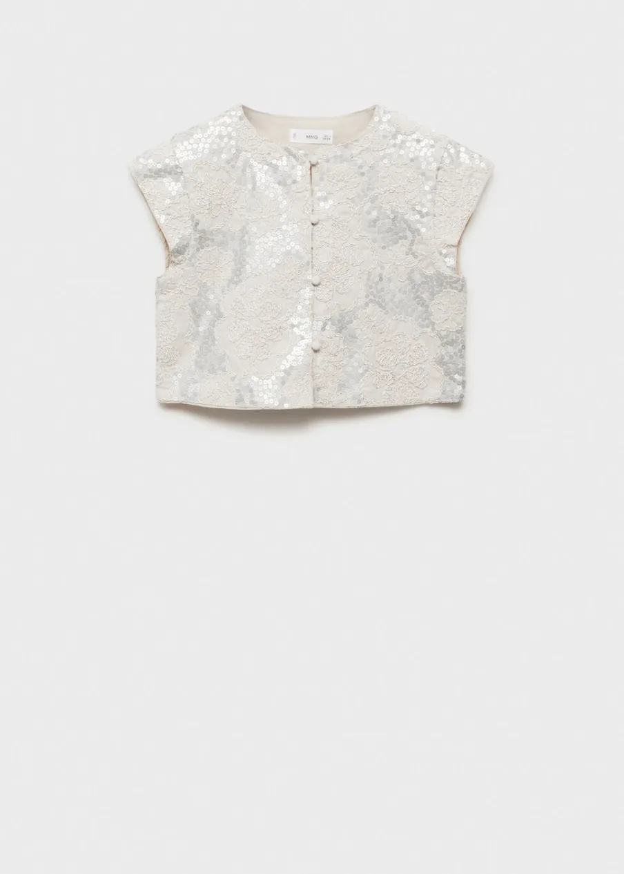 OpisBawełniana tkanina. Cekinowy haft. Deseń w kwiaty. Powlekane guziki. Okrągły dekolt. Krótki rękaw. Zapięcie n…