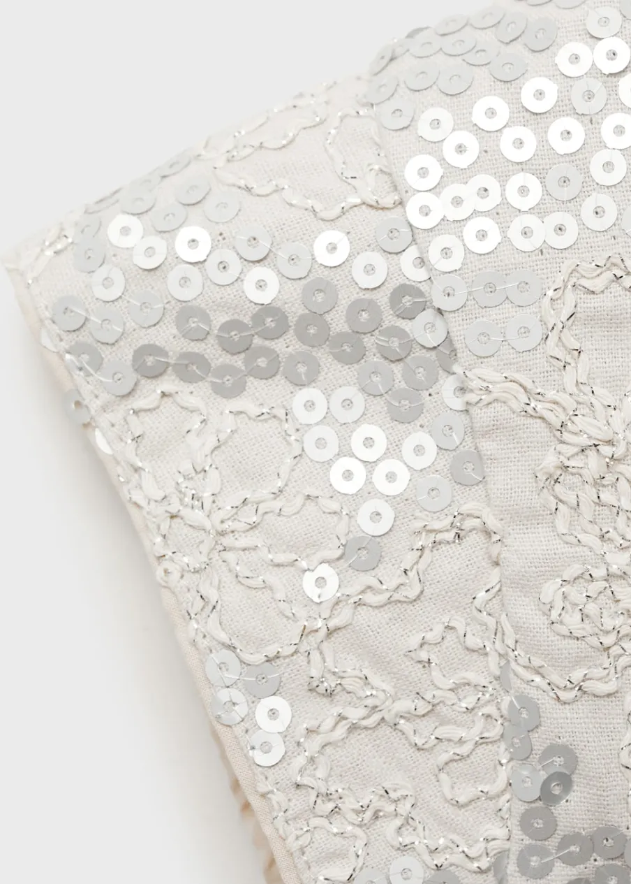 Bawełniana tkanina. Cekinowy haft. Deseń w kwiaty. Powlekane guziki. Okrągły dekolt. Krótki rękaw. Zapięcie na guziki z przodu.
