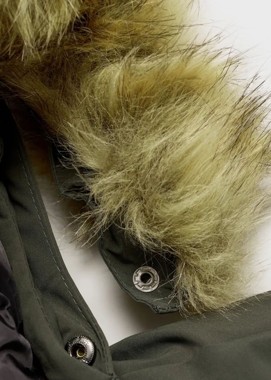 Kaptur z obszyciem ze sztucznego futra. Wewnętrzna podszewka. Trzy kieszenie z przodu. Etykieta na dane kontaktowe. Zapięcie na suwak i guziki. Podszewka.