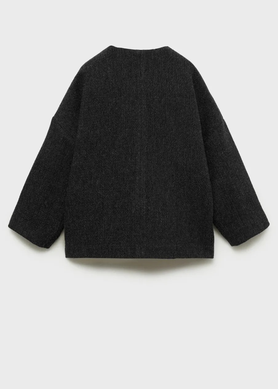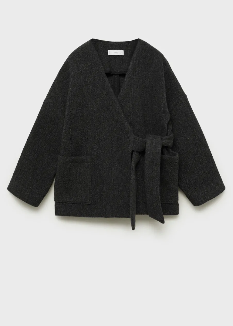 Wełniana tkanina. Fason kimono. Zakładany dekolt V. Wiązanie z boku. Długi rękaw. Dwie kieszenie nakładane po bokach. Limitowana edycja.