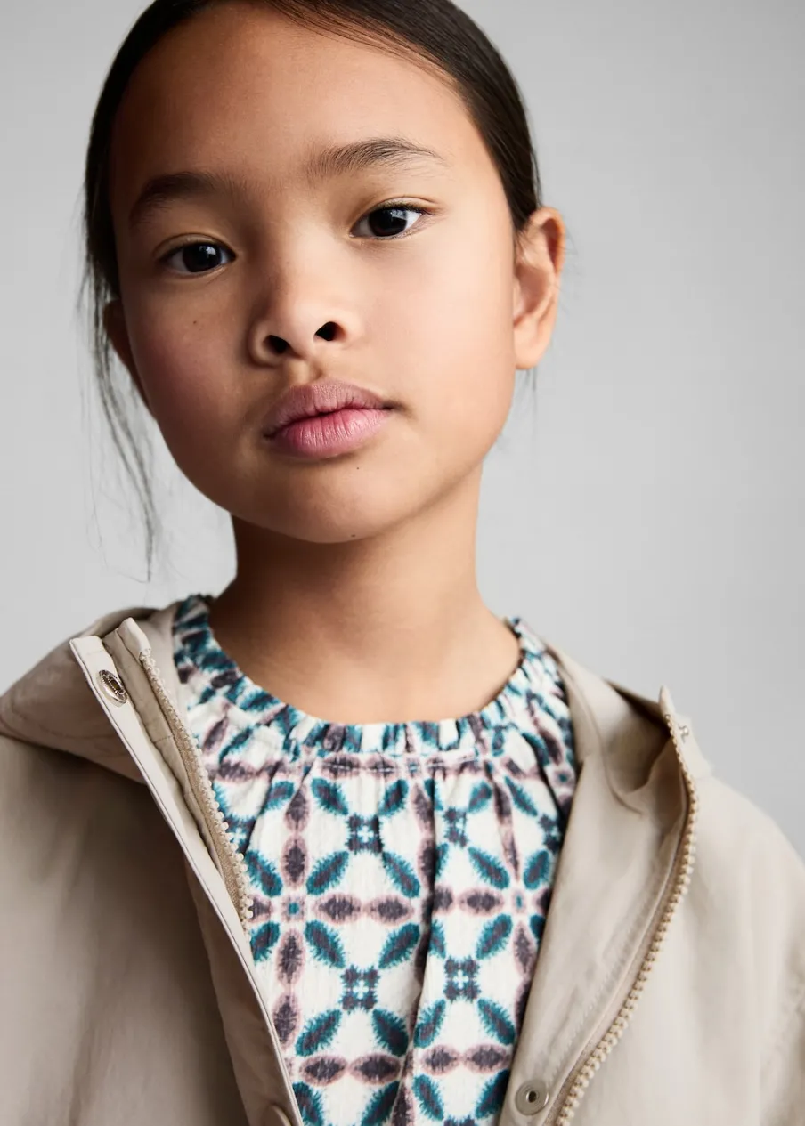 OpisTkanina nieprzemakalna. Wzorzysta podszewka. Dwie kieszenie z przodu. Kaptur. Długi rękaw z elastycznymi marszczon…
