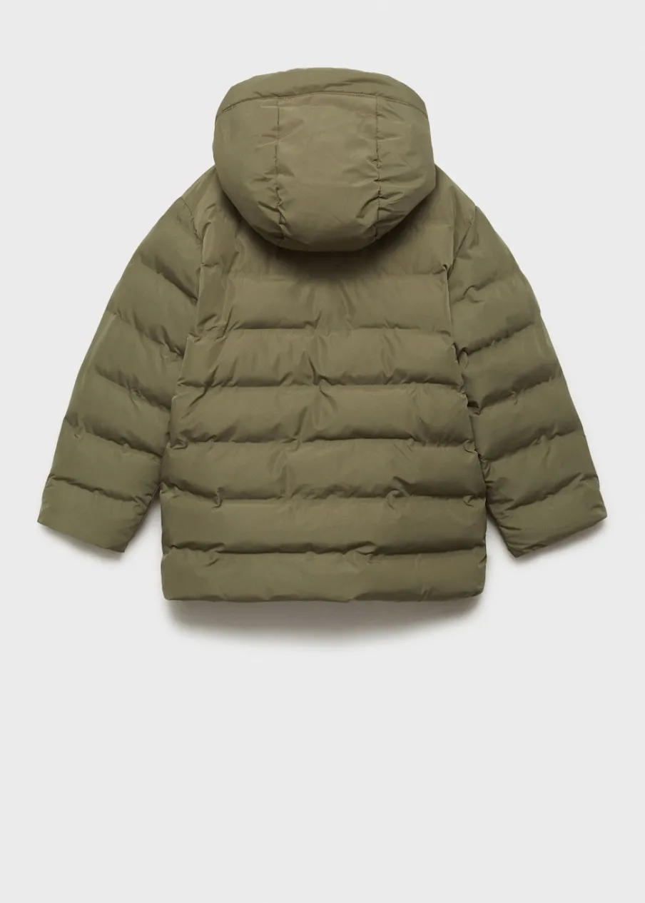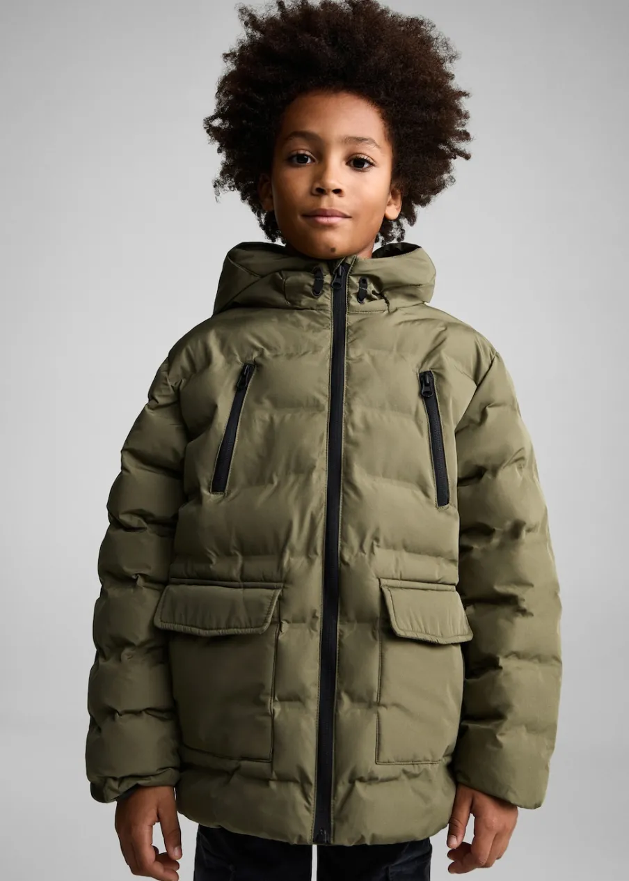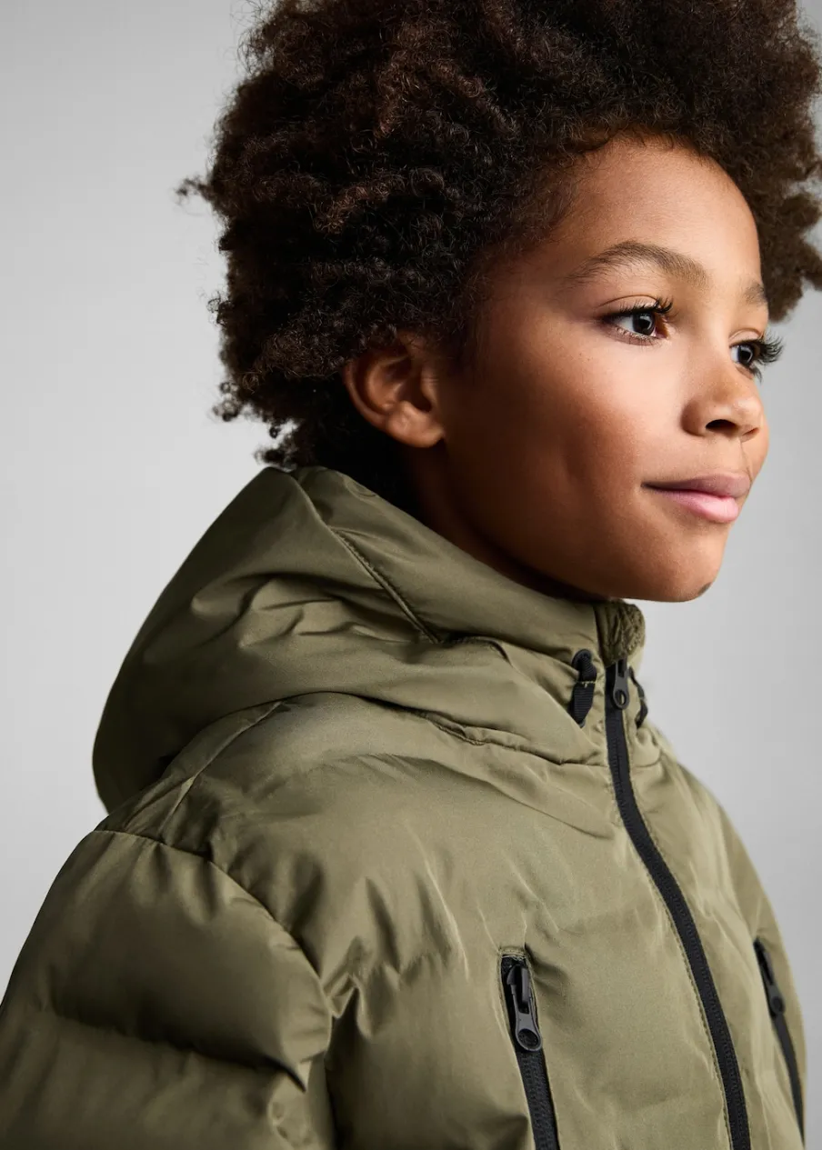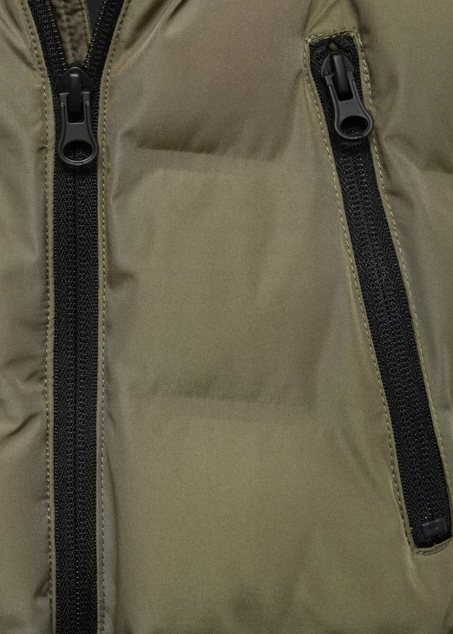 Model pikowany. Model prosty. Golf. Długi rękaw. Dwie kieszenie zapinane na suwak. Z przodu dwie naszywane kieszenie z zapięciem na guzik i dwie wpuszczane kieszenie. Wewnętrzna podszewka. Wewnętrzna etykieta na dane osobowe. Zapięcie na suwak.