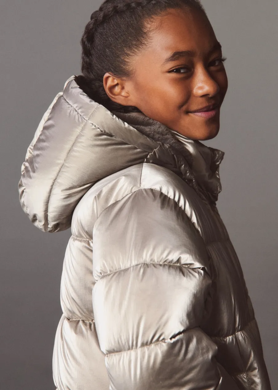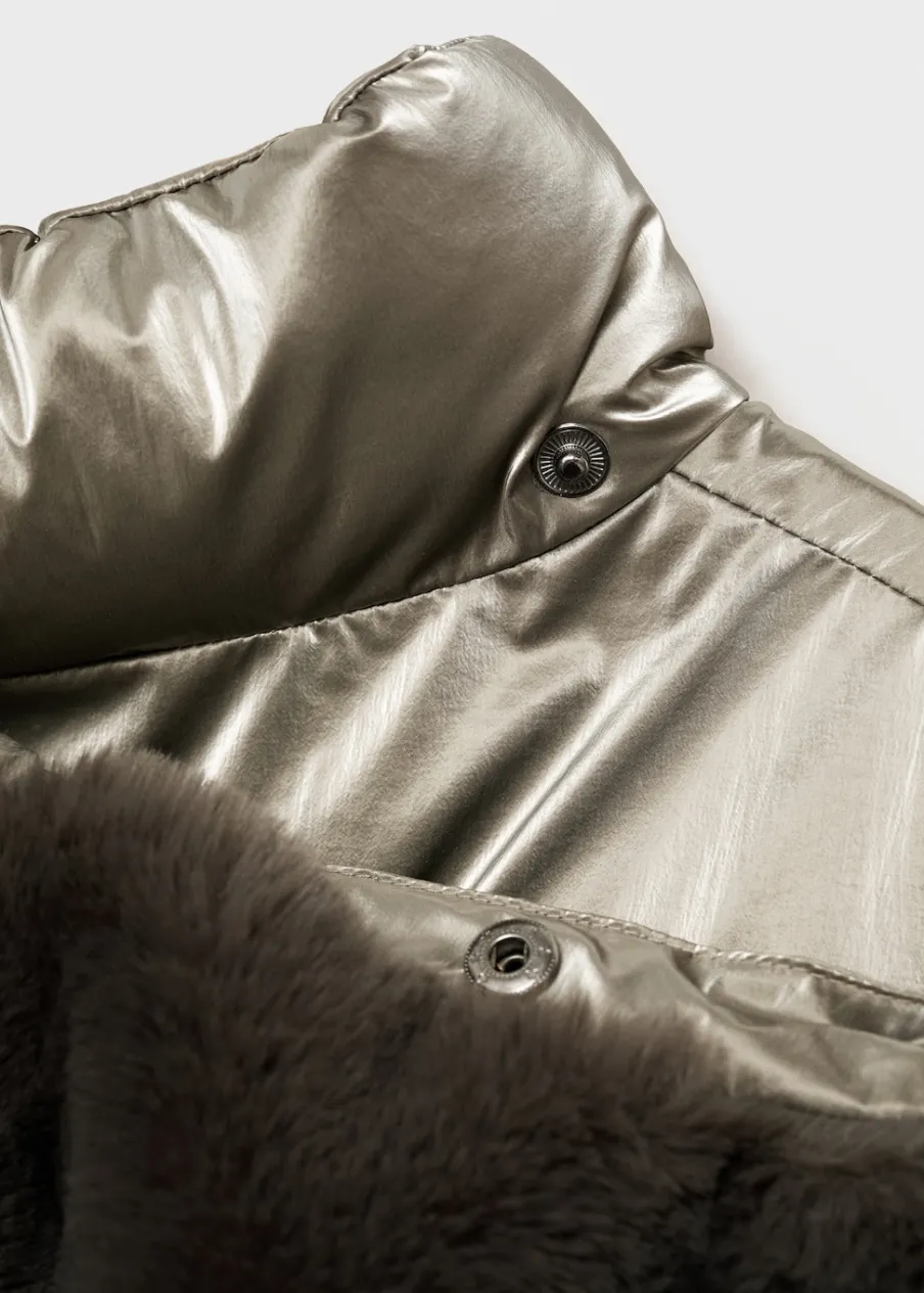 Model pikowany. Futrzana podszewka. Golf. Długi rękaw. Dwie kieszenie boczne. Wewnętrzna podszewka. Etykieta na dane kontaktowe. Zapięcie na zamek i guzik z przodu. Model prosty. Odpinany kaptur.