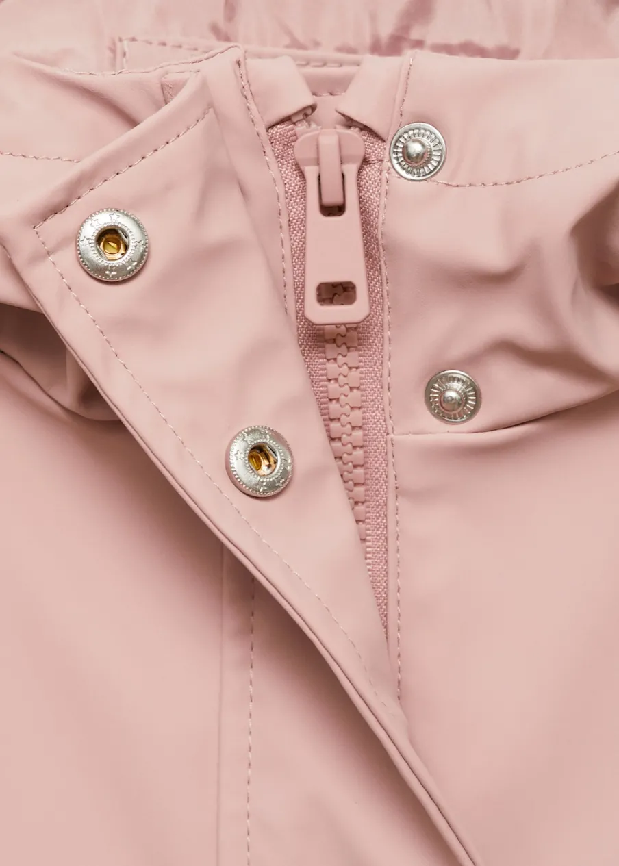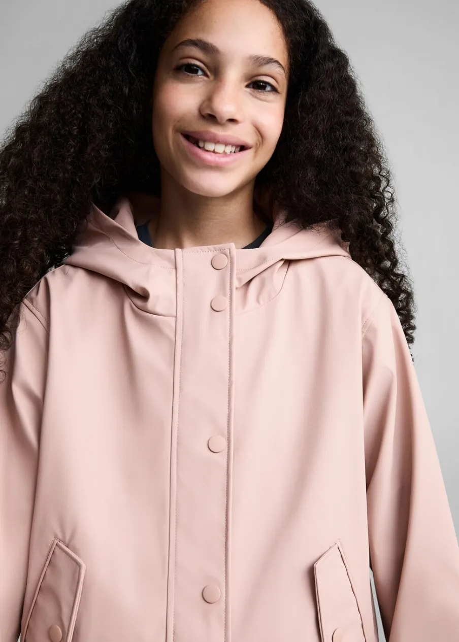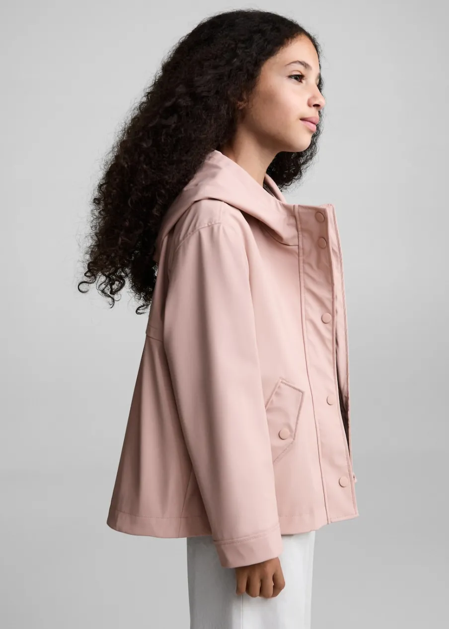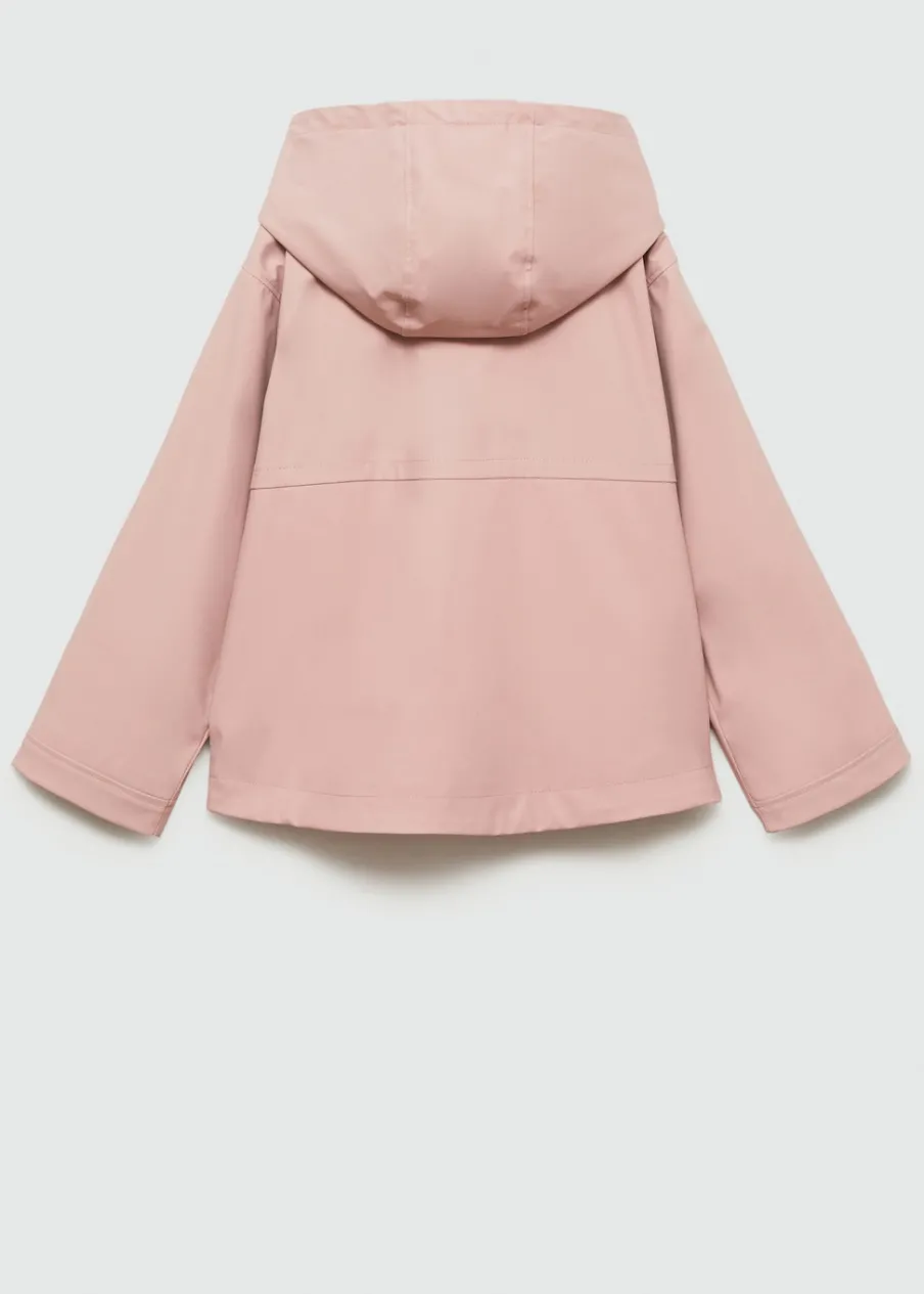 Nieprzemakalny materiał. Model prosty. Kaptur. Długi rękaw. Wewnętrzna podszewka. Dwie boczne kieszenie z guzikiem. Zapięcie na suwak i guziki. Etykieta na dane kontaktowe.