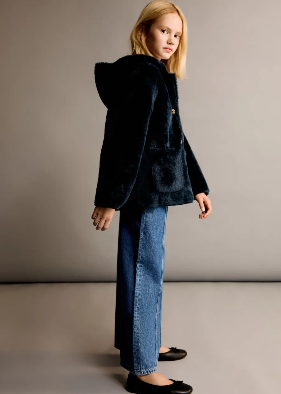 Model prosty. Włochata tekstura. Kaptur. Dwie kieszenie nakładane po bokach. Długi rękaw. Wewnętrzna podszewka. Zapięcie na guziki z przodu.