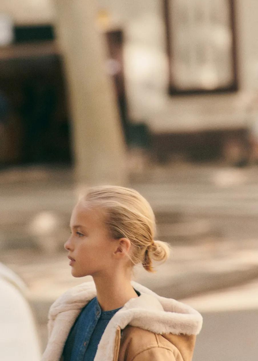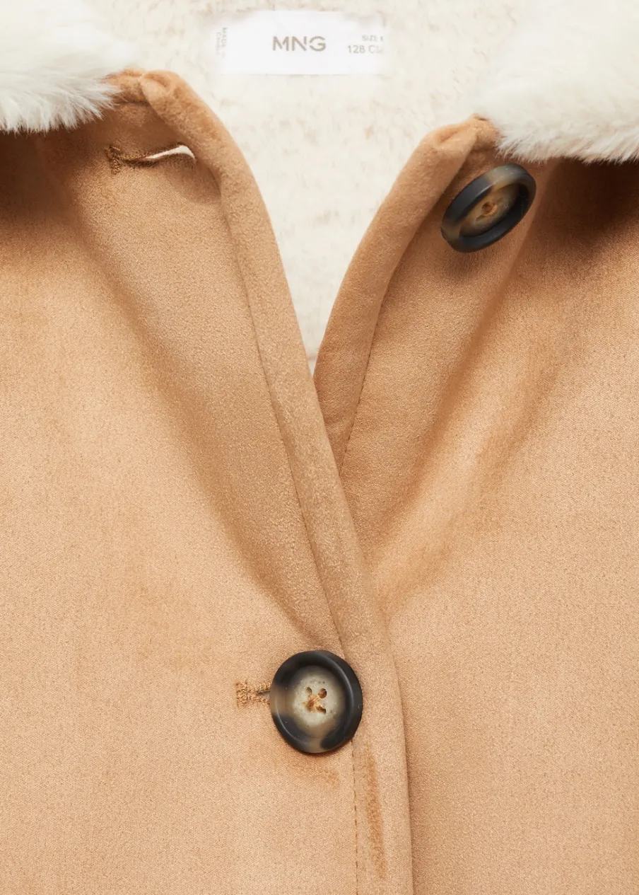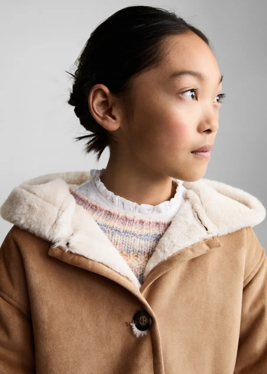 Sztuczny zamsz. Model prosty. Model długi. Okrągły dekolt. Kaptur. Długi rękaw. Futrzana podszewka. Dwie kieszenie boczne. Wewnętrzna etykieta na dane osobowe. Zapięcie na guziki.