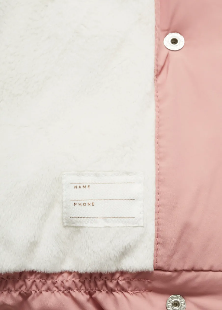 Model pikowany. Model prosty. Futrzana podszewka. Kaptur. Długi rękaw. Etykieta na dane kontaktowe. Zapięcie na zatrzaski z przodu.