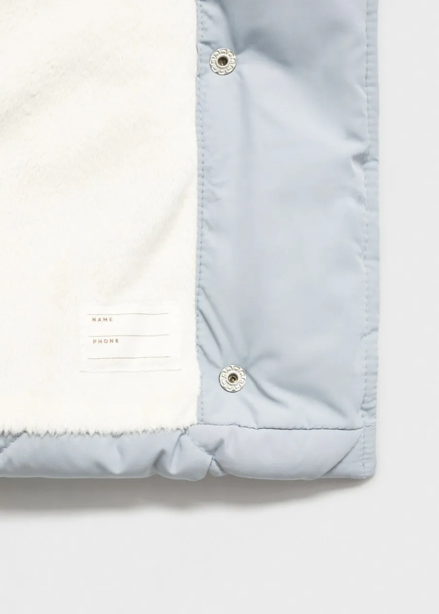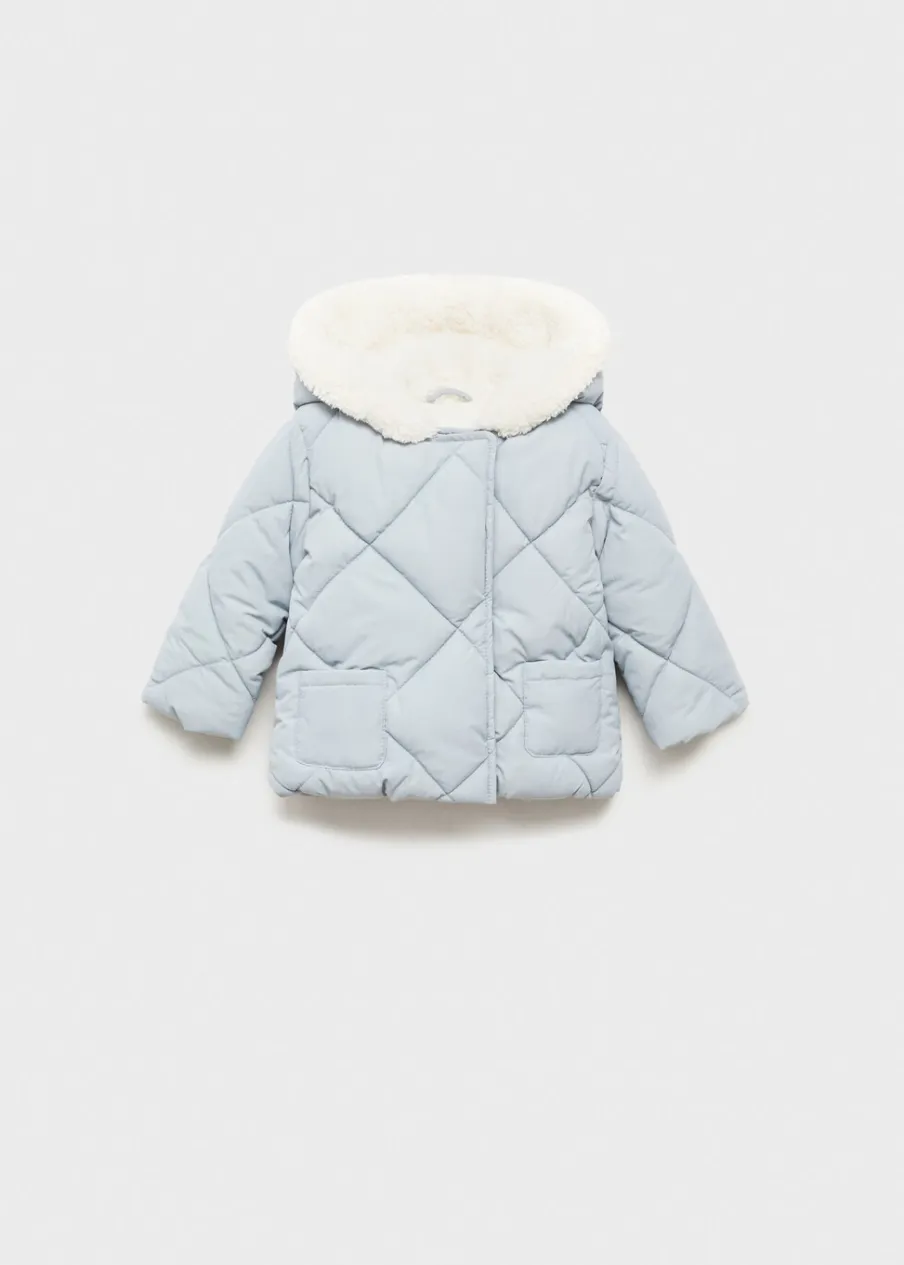 Model pikowany. Model prosty. Kaptur z uszkami. Długi rękaw. Dwie kieszenie z przodu. Etykieta na dane kontaktowe. Zapięcie na zatrzaskowe guziki. Kurtka puchowa podszyta futerkiem.