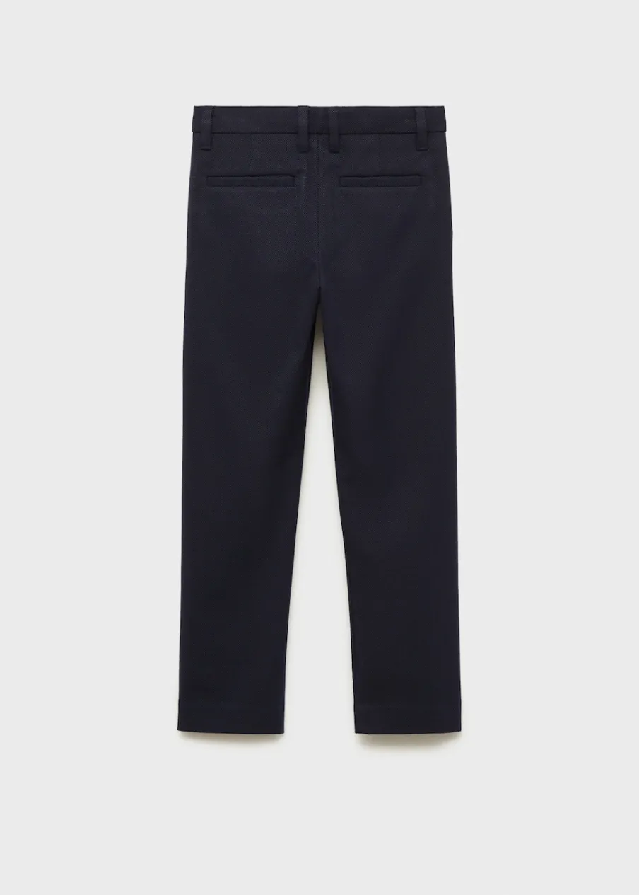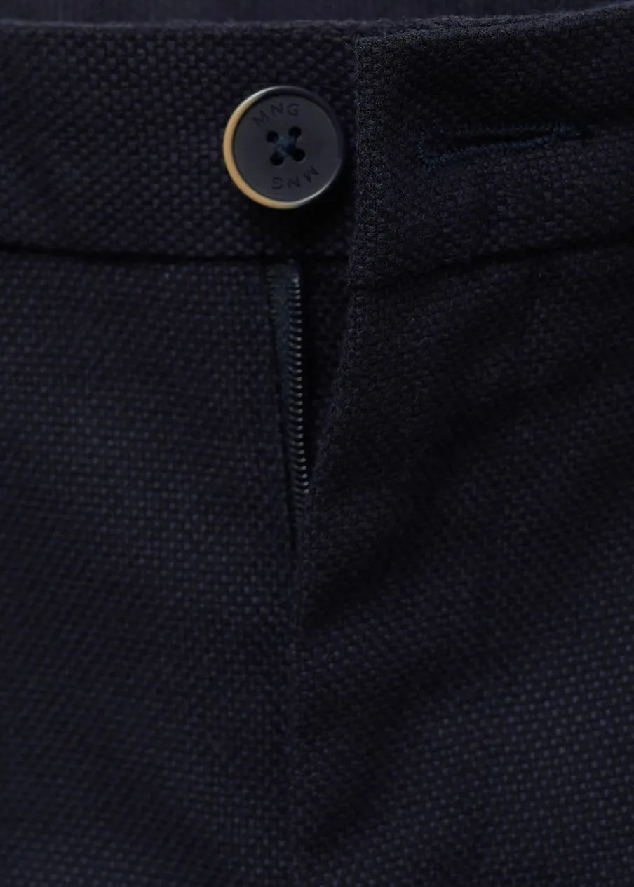 Bawełniana tkanina. Tkanina z piki. Model prosty. Dwie kieszenie boczne. Dwie wpuszczane kieszenie z tyłu. Szlufki. Zapięcie na guzik i zamek.