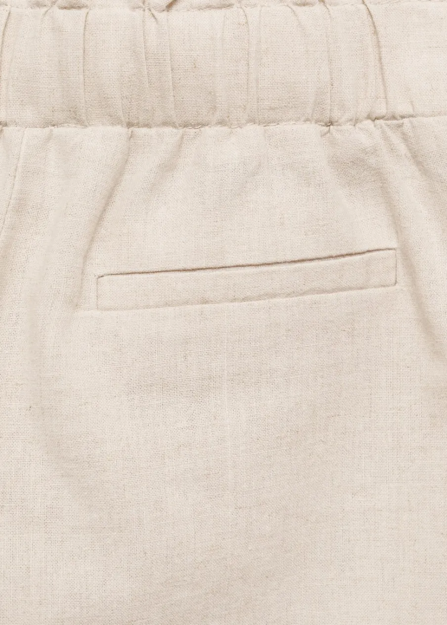 Tkanina z mieszanki lnu i bawełny. Model prosty. Elastyczny pas. Kieszeń z wypustkami z tyłu. Zapięcie na guzik w talii.