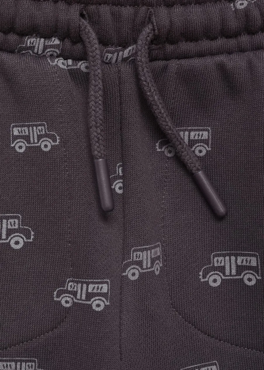 Bawełna 100%. Fason jogger. Nadruk. Elastyczny pas. Nogawki wykończone gumką. Wiązanie na sznurek. Dwie kieszenie boczne. Naszywana kieszeń z tyłu.