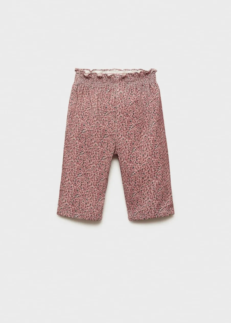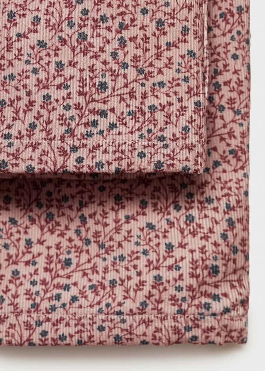 Tkanina sztruksowa. Model prosty. Elastyczny pas. Kwiatowy wzór. Marszczona tekstura. Bez zapięcia.