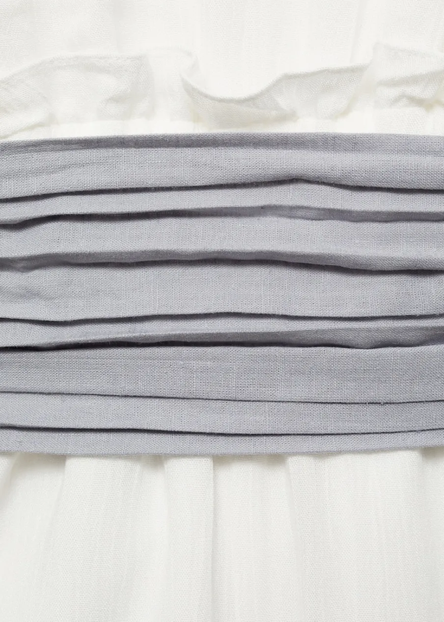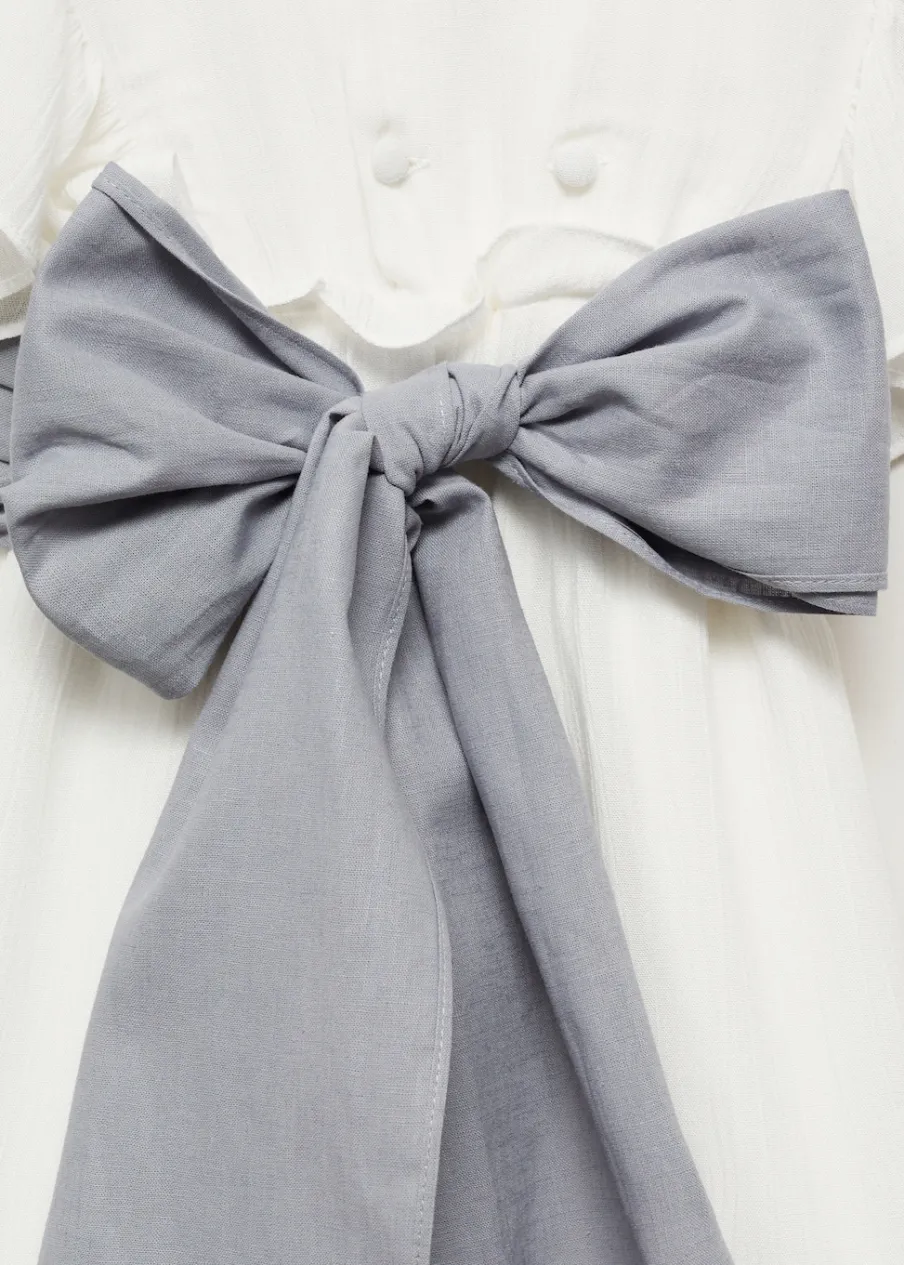 OpisZ teksturą. Model długi. Okrągły dekolt. Falbanki na rękawach. Wstążka w pasie wiązana na kokardę. Dekolt n…