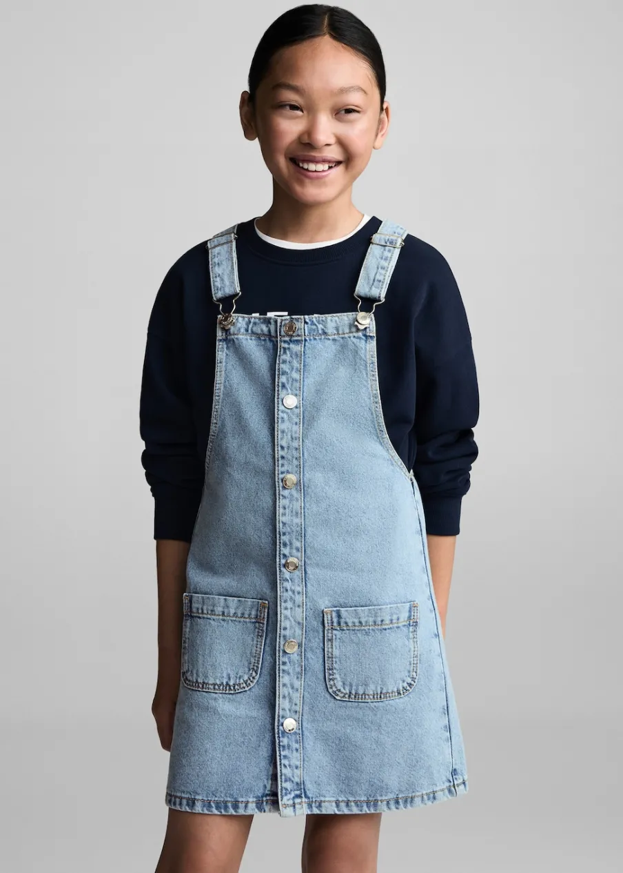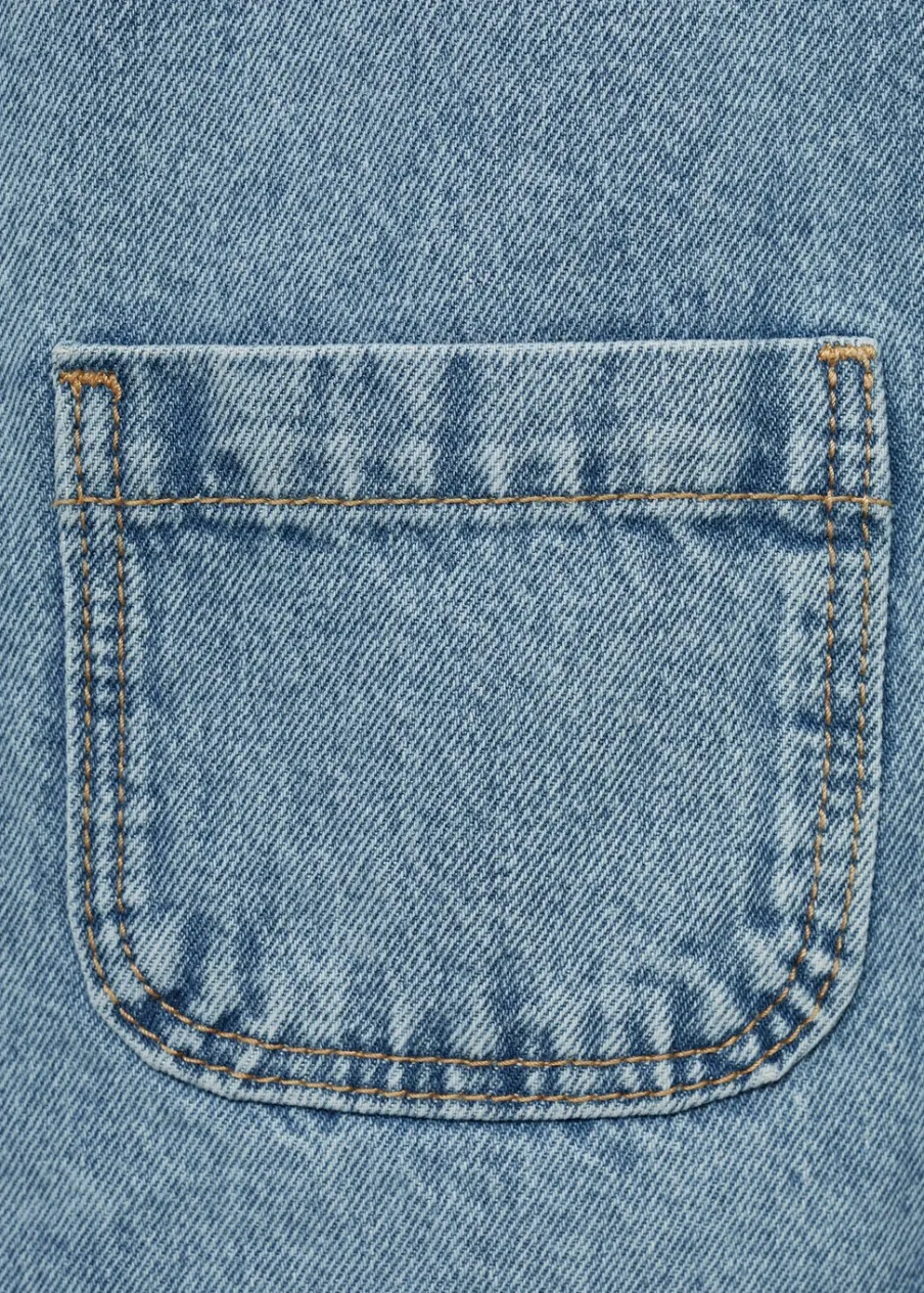 Kolekcja Powrót do szkoły. Tkanina bawełniana w dżinsowym stylu. Model prosty. Krótki krój. Kwadratowy dekolt. Szerokie ramiączka. Zapięcie na haftki. Dwie kieszenie z przodu. Zapięcie na guziki z przodu.
