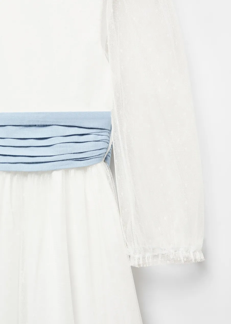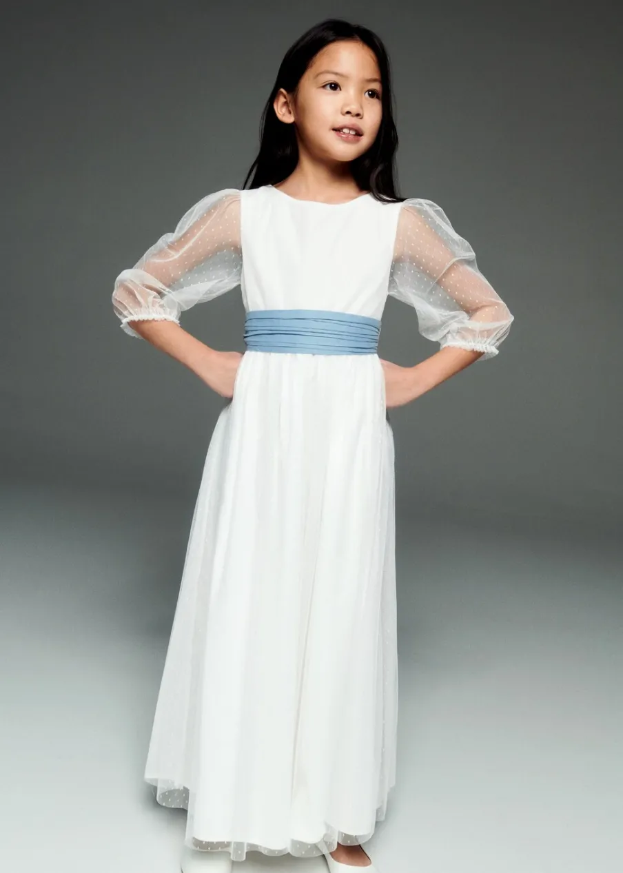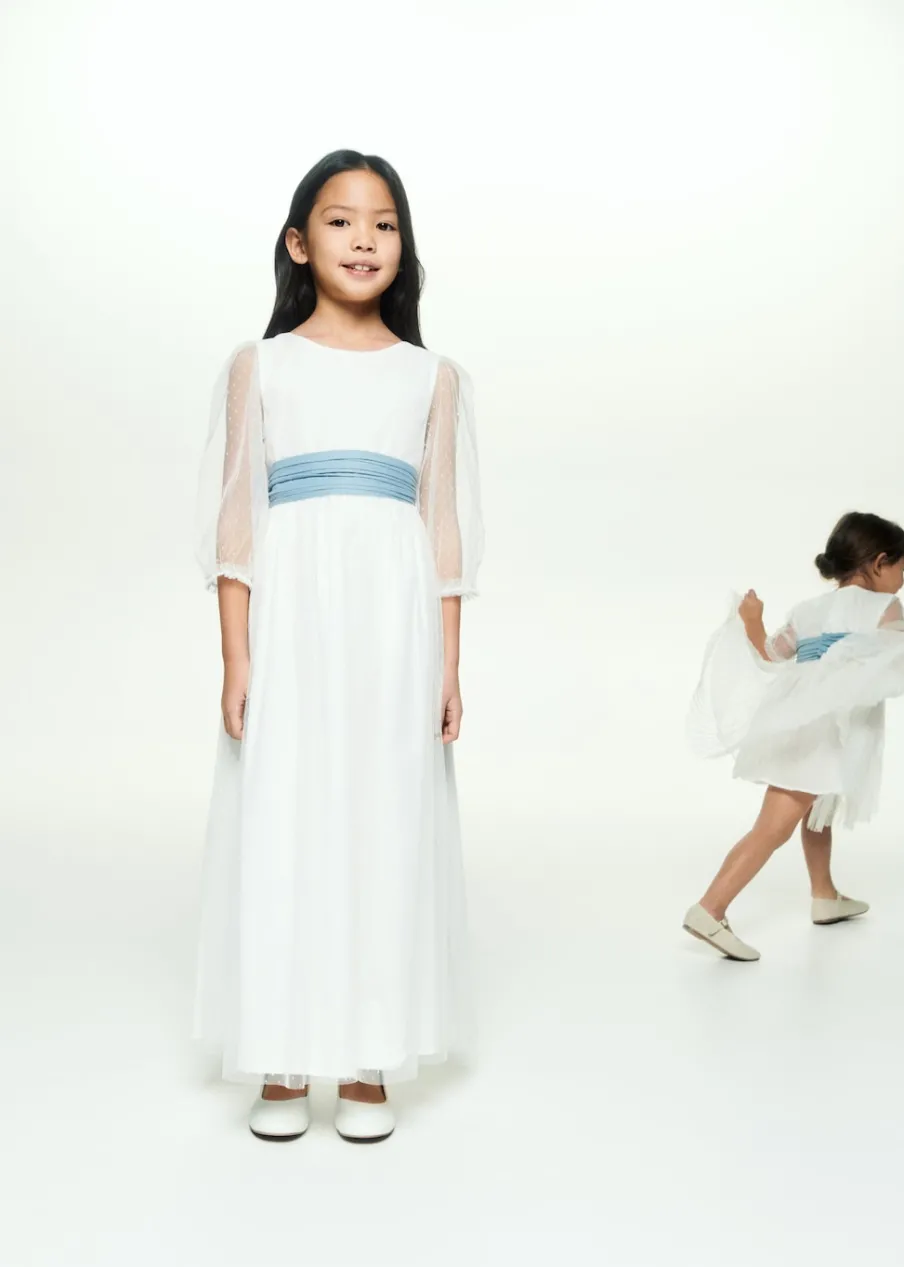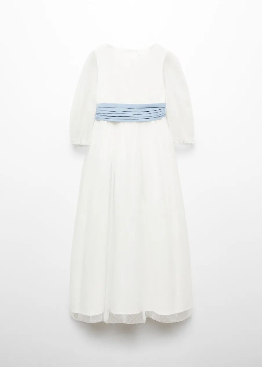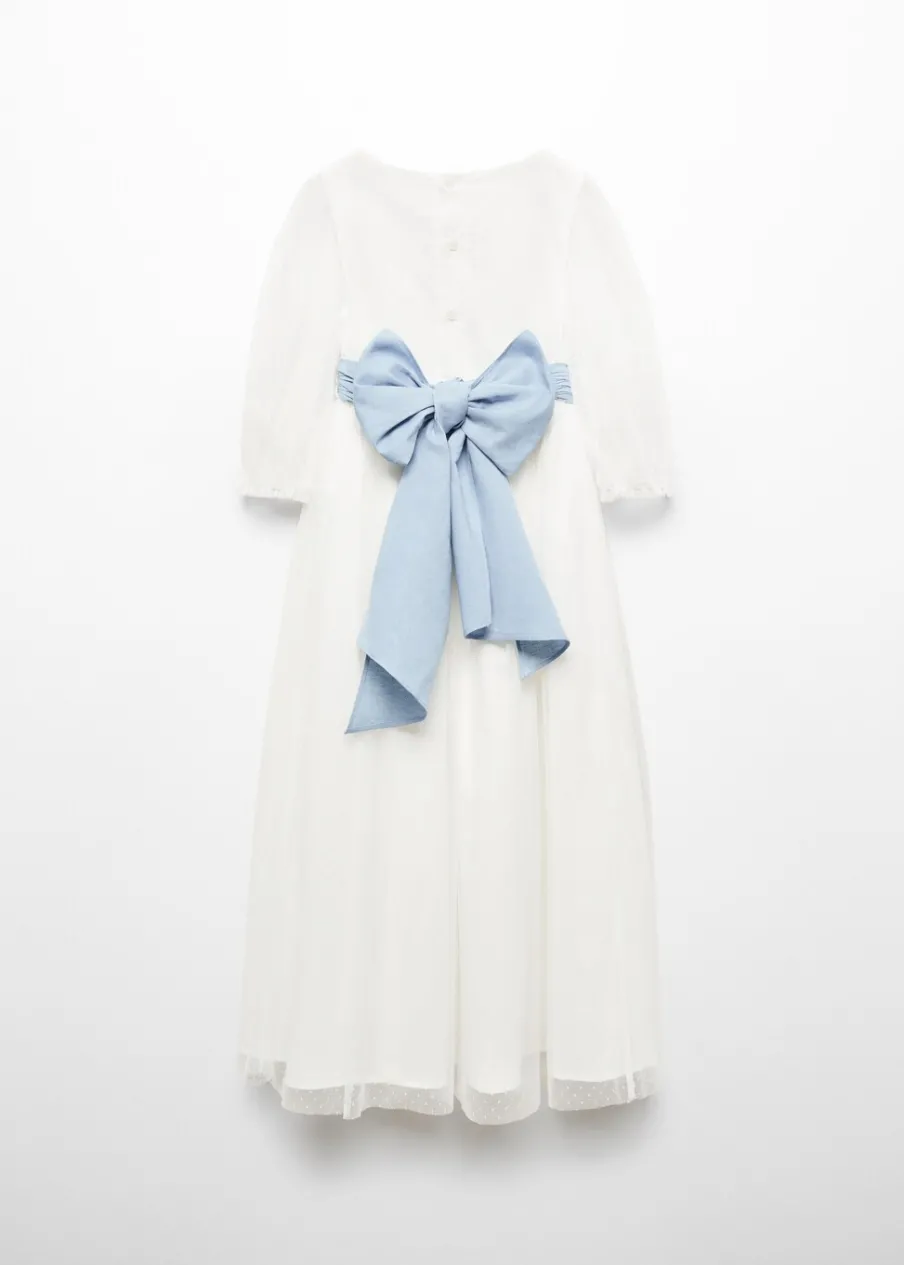 Tkanina plumeti. Model prosty. Model długi. Wiązane zapięcie. Zapięcie na guziki. Okrągły dekolt. Długi rękaw. Sukienka ma długość 100 cm. Model ma 140 cm wzrostu i nosi rozmiar 10. Zapięcie z tyłu. Dekolt w kształcie łódki. Rękaw trzy czwarte. Bez podszewki. Cienka tkanina. Model evasé.