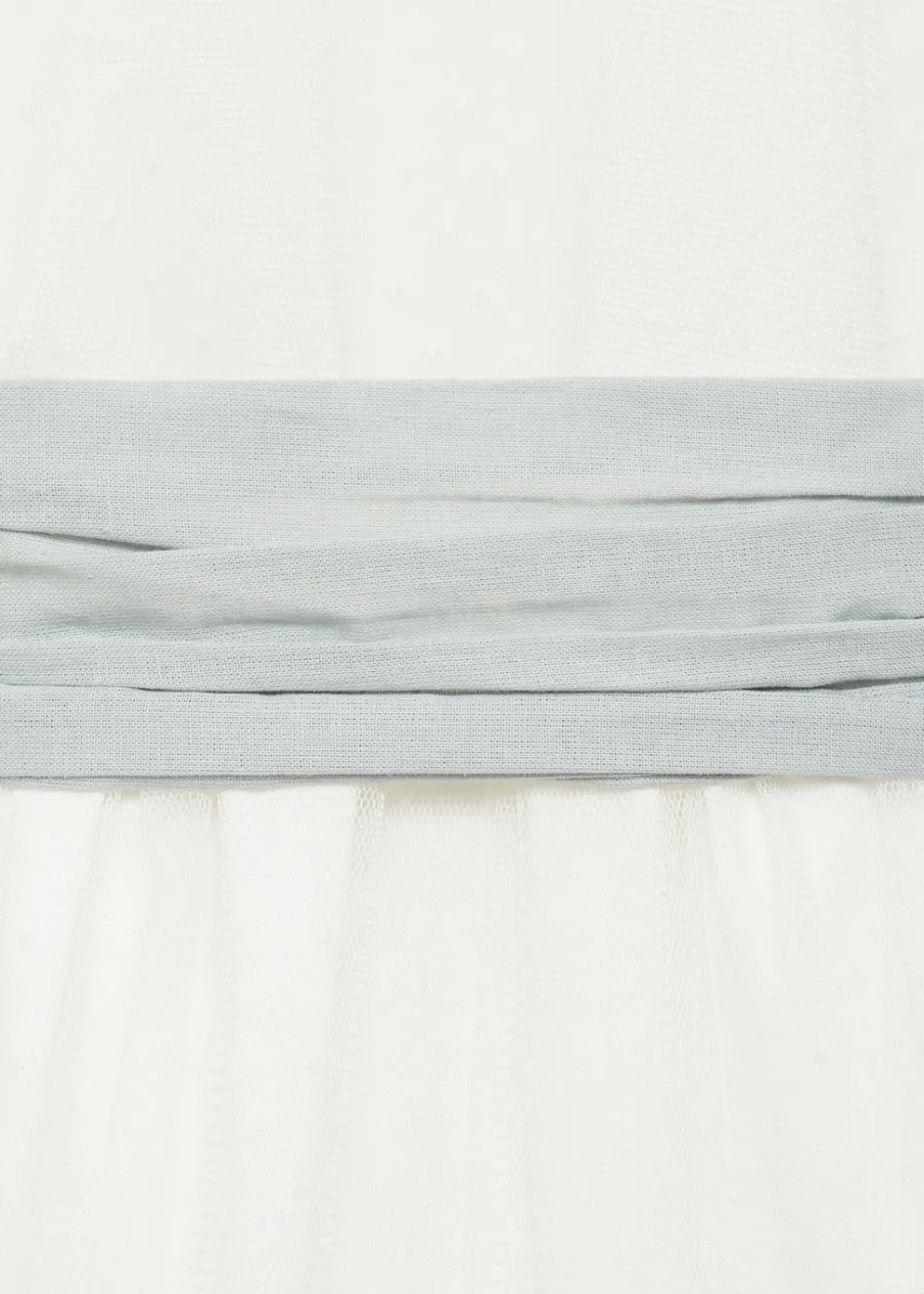 OpisTkanina plumeti. Model długi. Okrągły dekolt. Krótki rękaw. Wstążka w pasie wiązana na kokardę. Dekolt w sz…