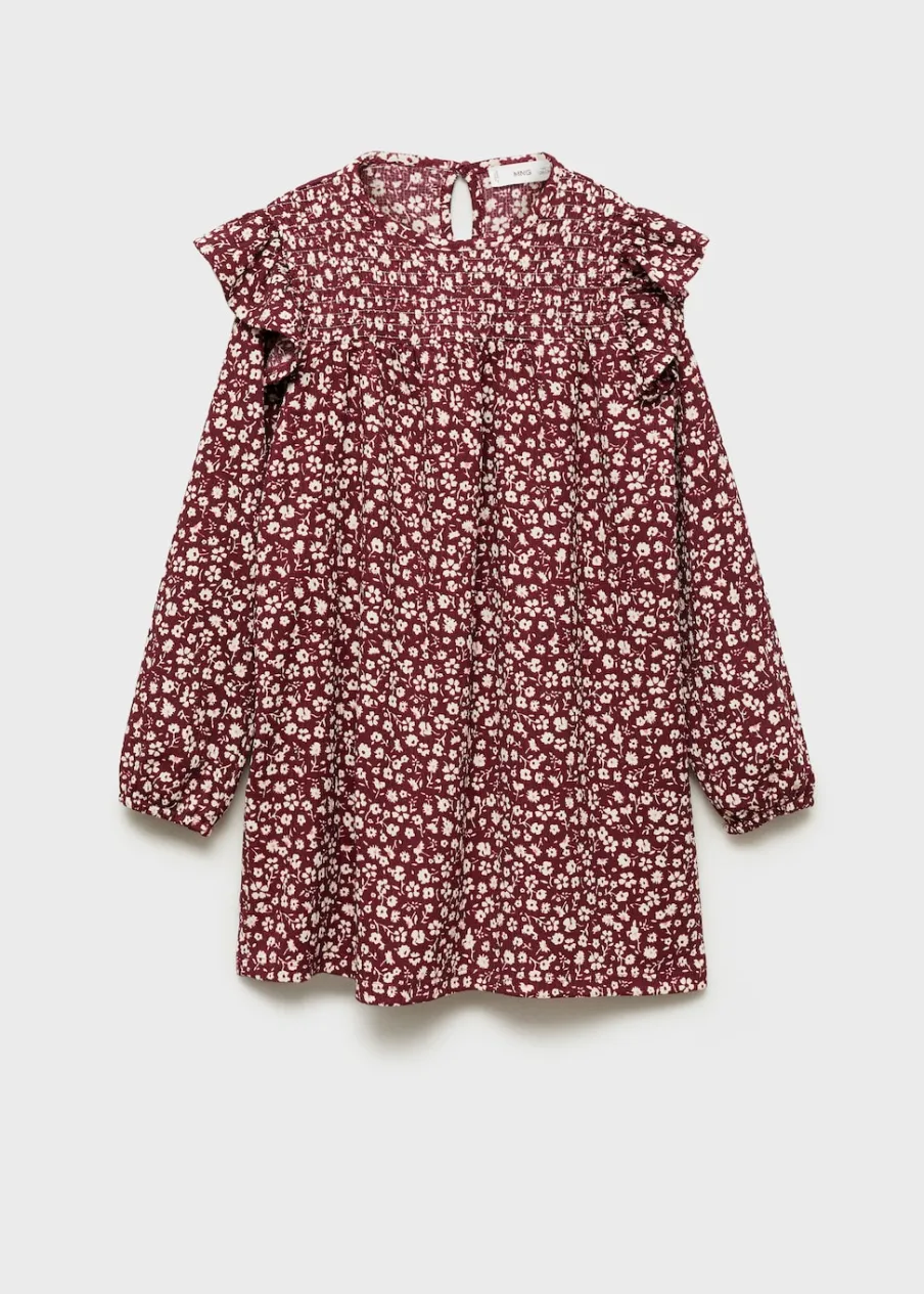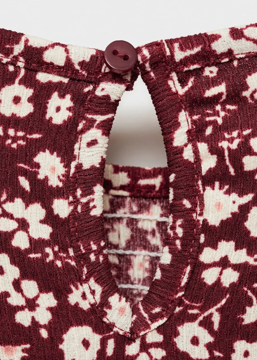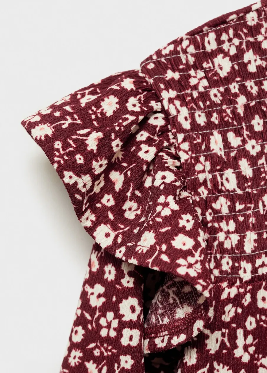 Model prosty. Kwiatowy wzór. Okrągły dekolt. Długi rękaw. Krótki krój. Marszczony detal. Z falbanami. Zapięcie na guzik z tyłu.