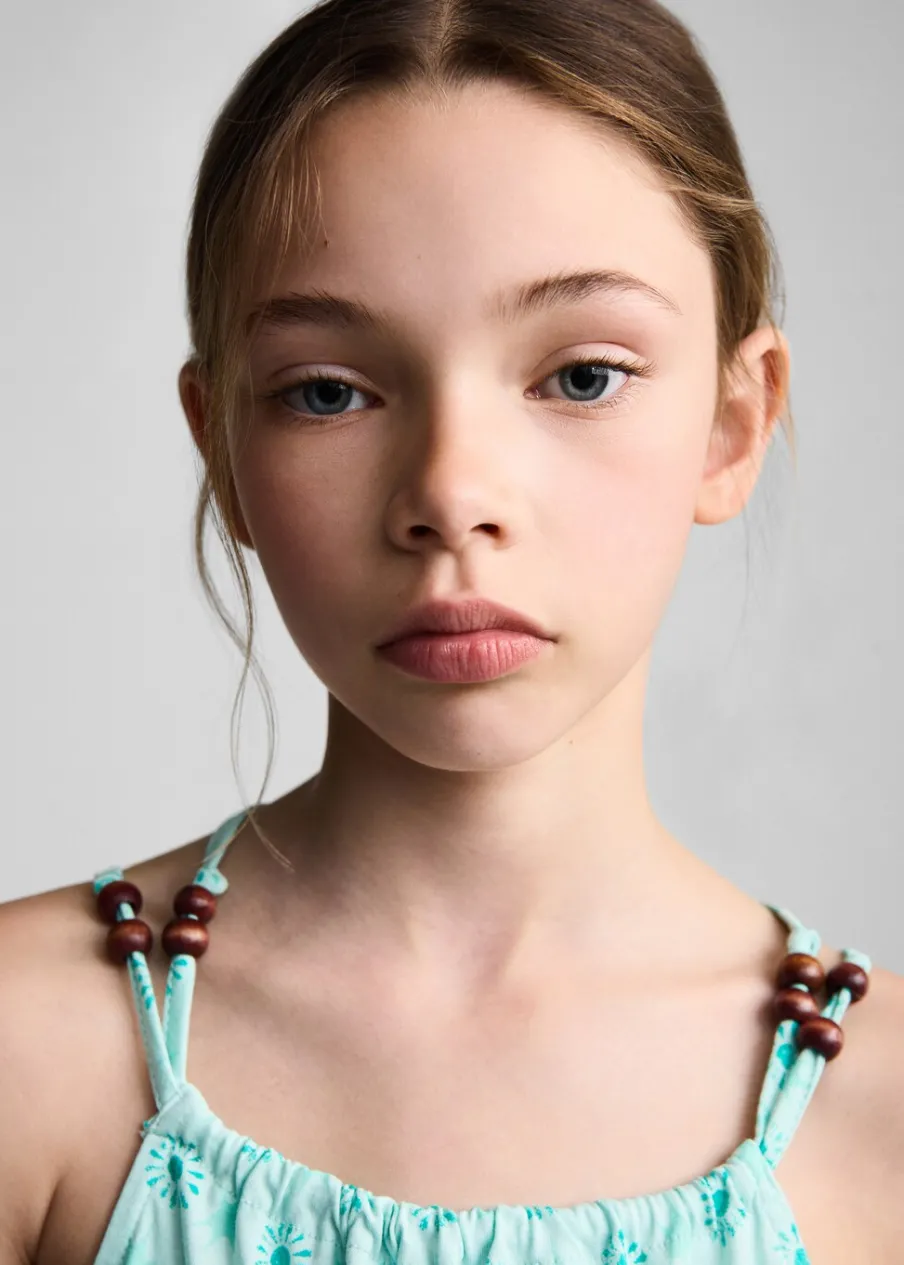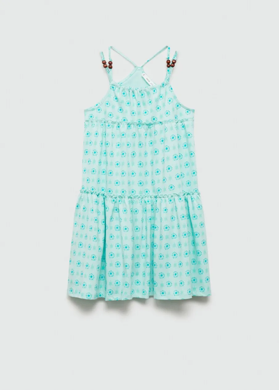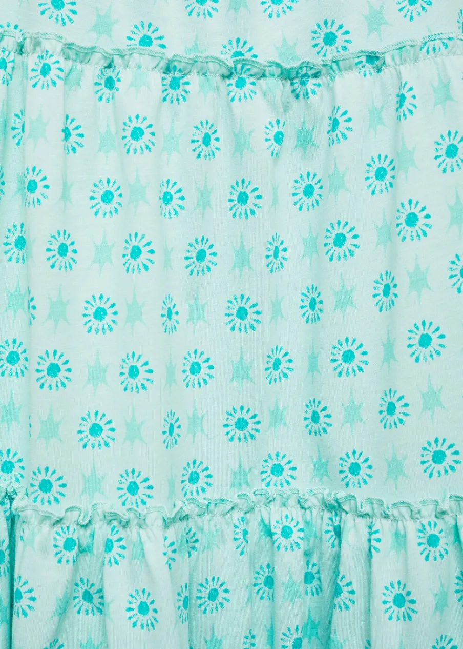 100% bomull. Model prosty. Krótki krój. Model z falbankami. Cienkie ramiączka. Ozdobne koraliki. Okrągły dekolt. Bez rękawów. Bez zapięcia. Nadruk.