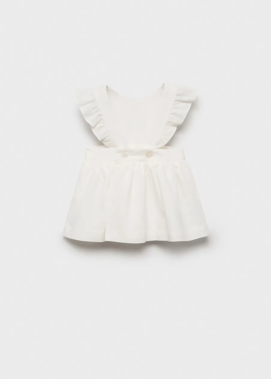 Bawełniana tkanina. Tkanina lniana. Krótki rękaw z falbanką. Okrągły dekolt. Ozdobne marszczenie. Falbanka w talii. Zapięcie na guziki w pasie.