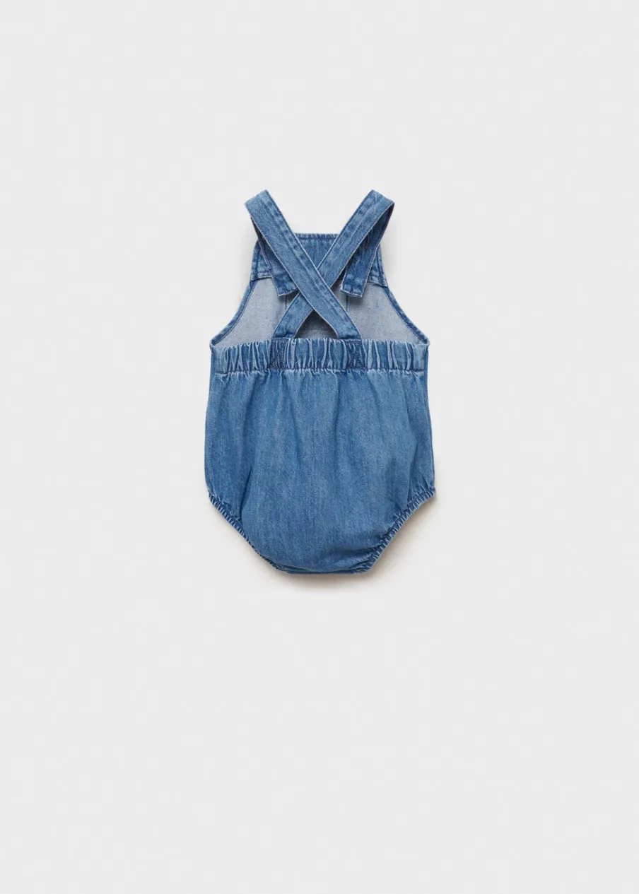 Tkanina bawełniana w dżinsowym stylu. Krótki krój. Kwadratowy dekolt. Ramiączka z zapięciem na guzik. Naszywana kieszeń z przodu.