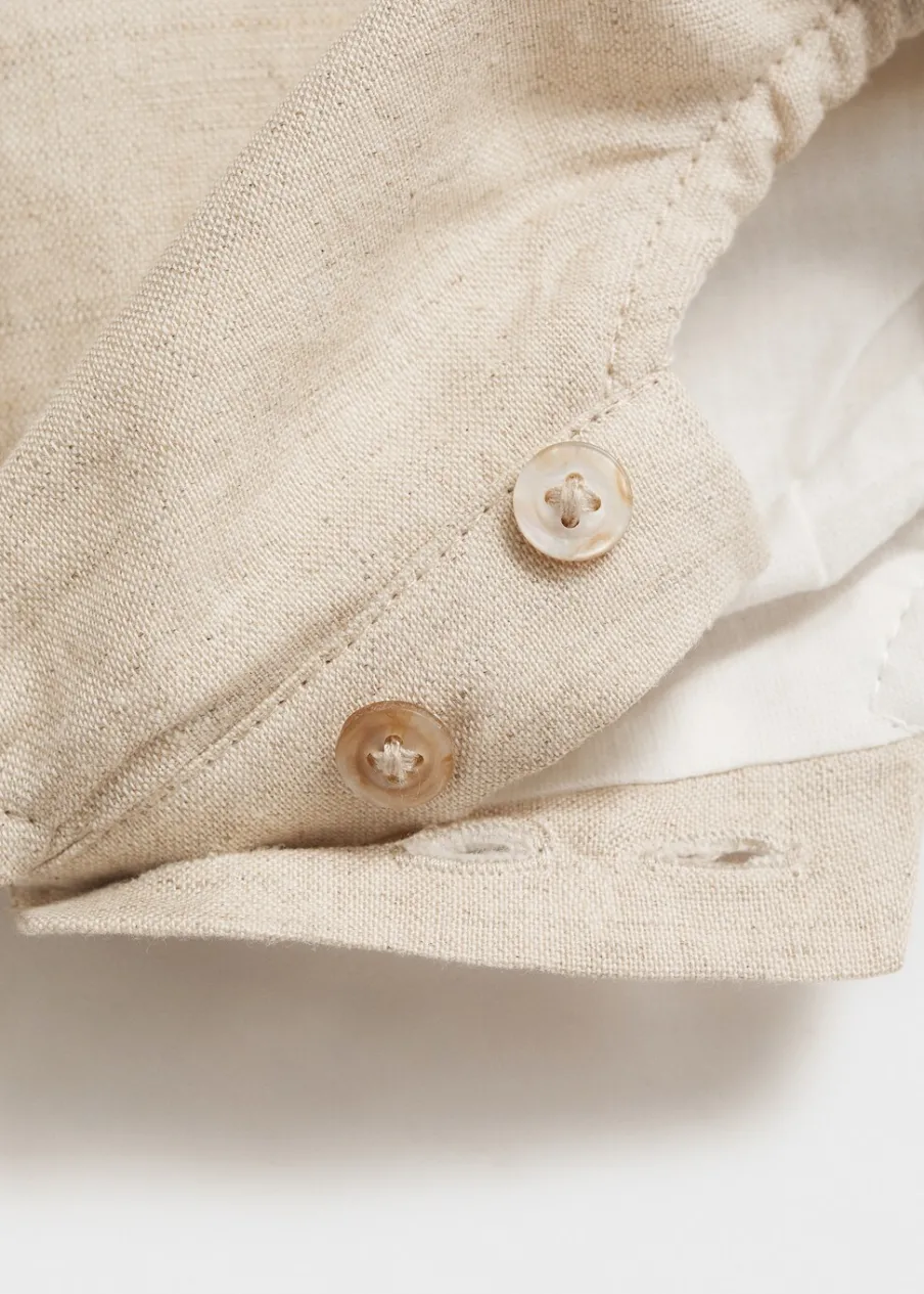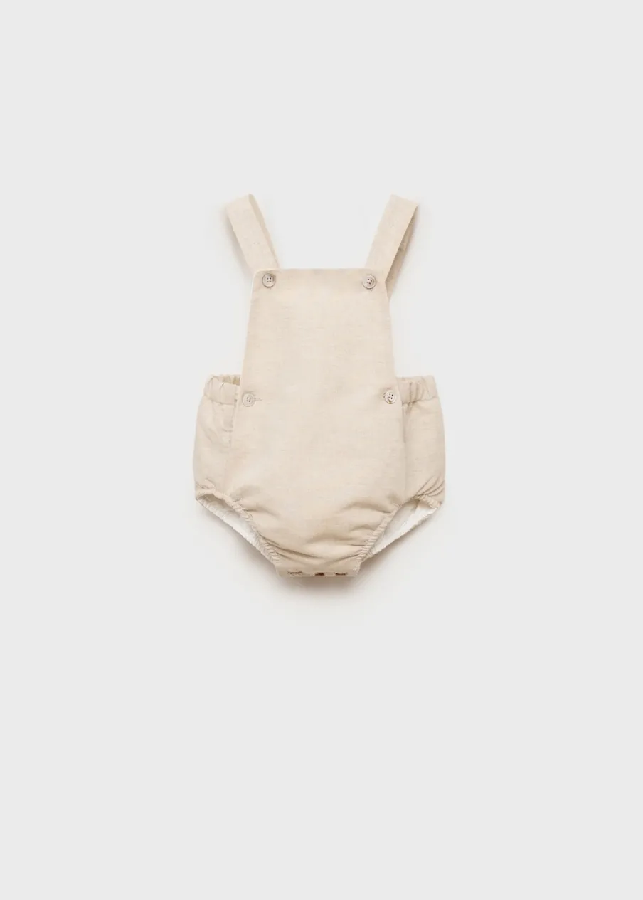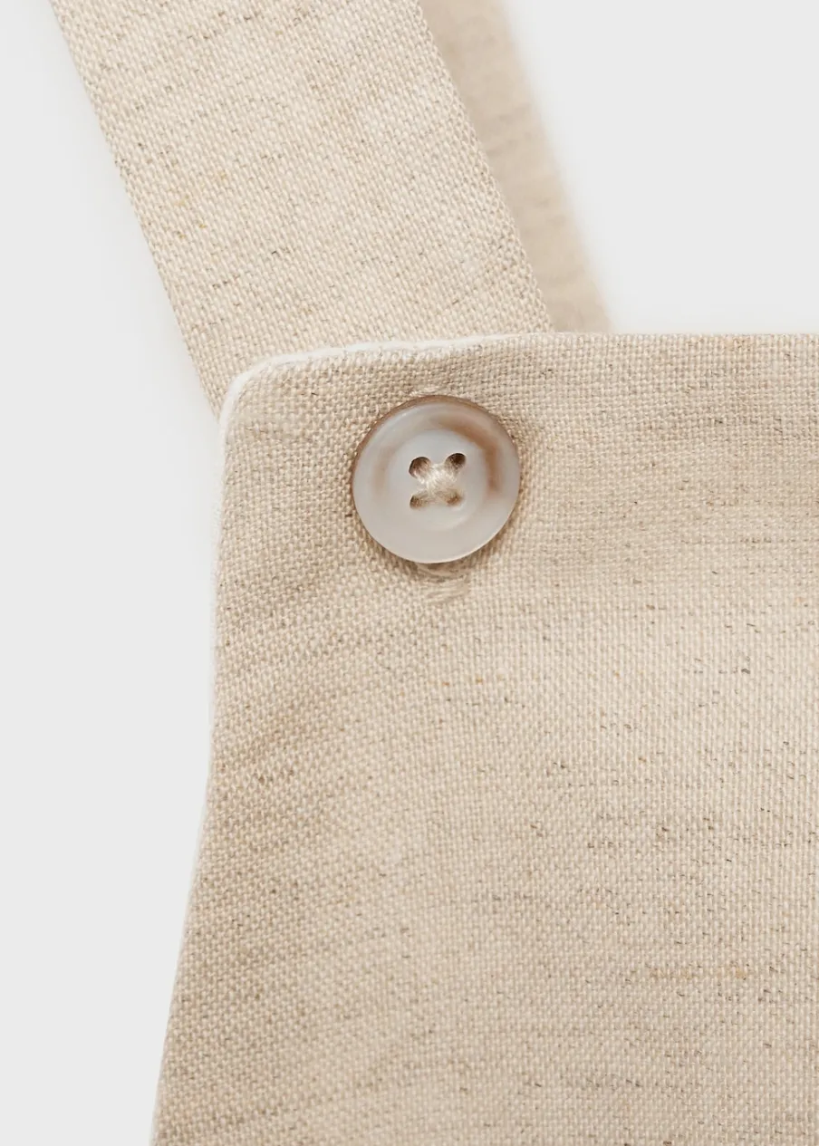 Bawełniana tkanina. Tkanina lniana. Kwadratowy dekolt. Skrzyżowane ramiączka. Regulowany pas z gumką i guzikiem. Ramiączka z zapięciem na guzik. Elastyczna gumka u dołu.