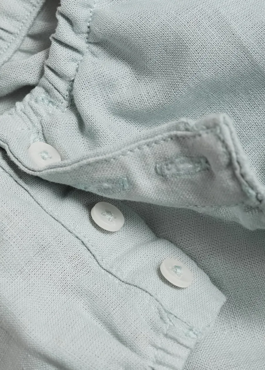 Bawełniana tkanina. Tkanina lniana. Krótki krój. Skrzyżowane ramiączka. Elastyczna gumka u dołu. Elastyczny pas.