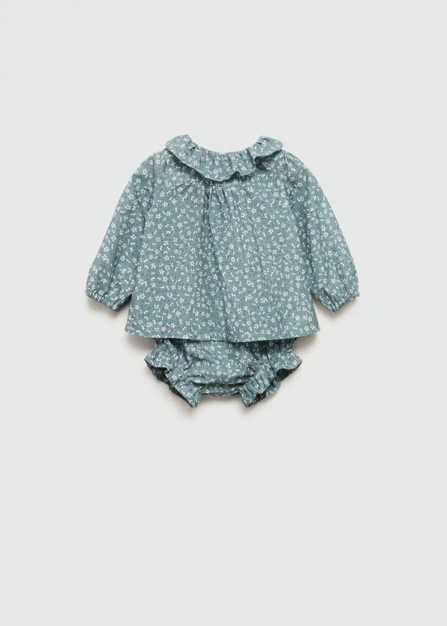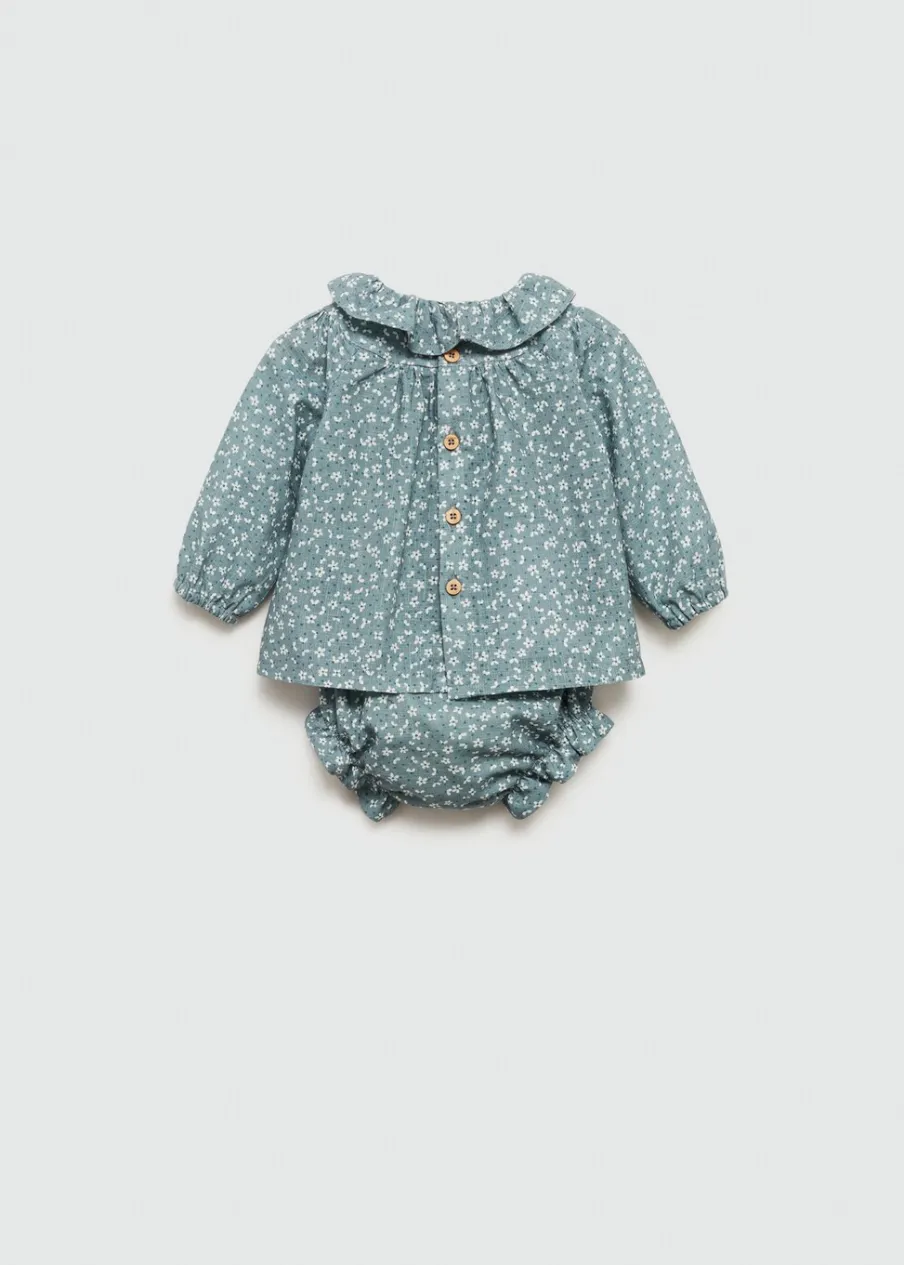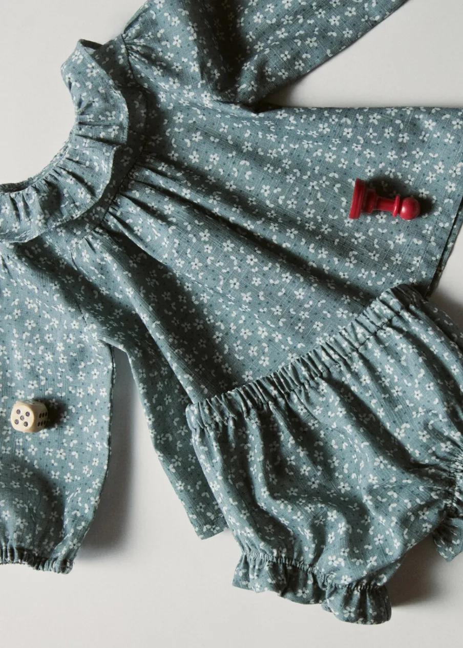 Zestaw sukienka i majteczki. Bawełna 100%. Model prosty. Kwiatowy wzór. Okrągły dekolt. Falbanki pod szyją. Długi rękaw. Zapięcie z tyłu na guziki. Guziki z imitacji drewna.