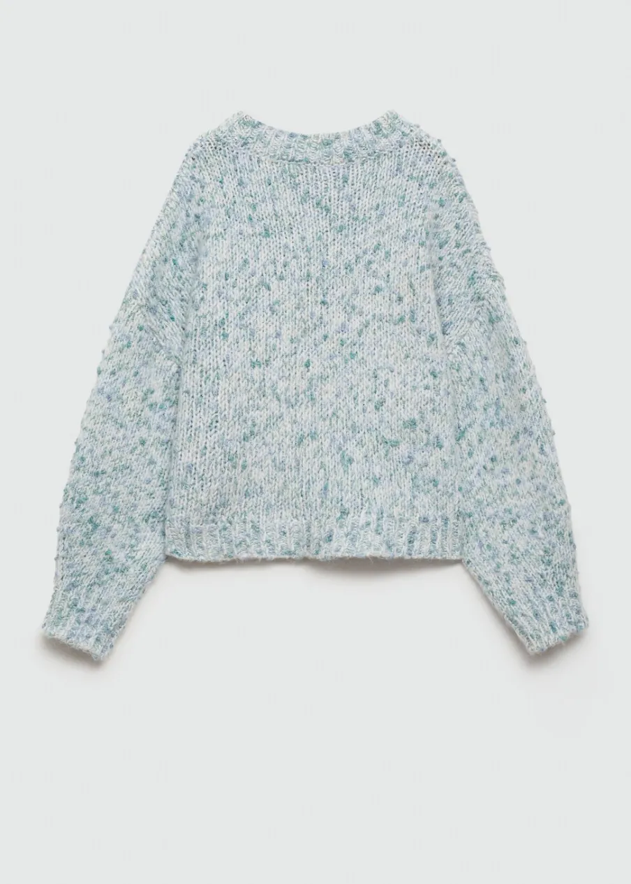 Tkanina z grubej dzianiny. Model prosty. Dzianina ze splotem warkoczowym. Dwukolorowe. Długi rękaw.