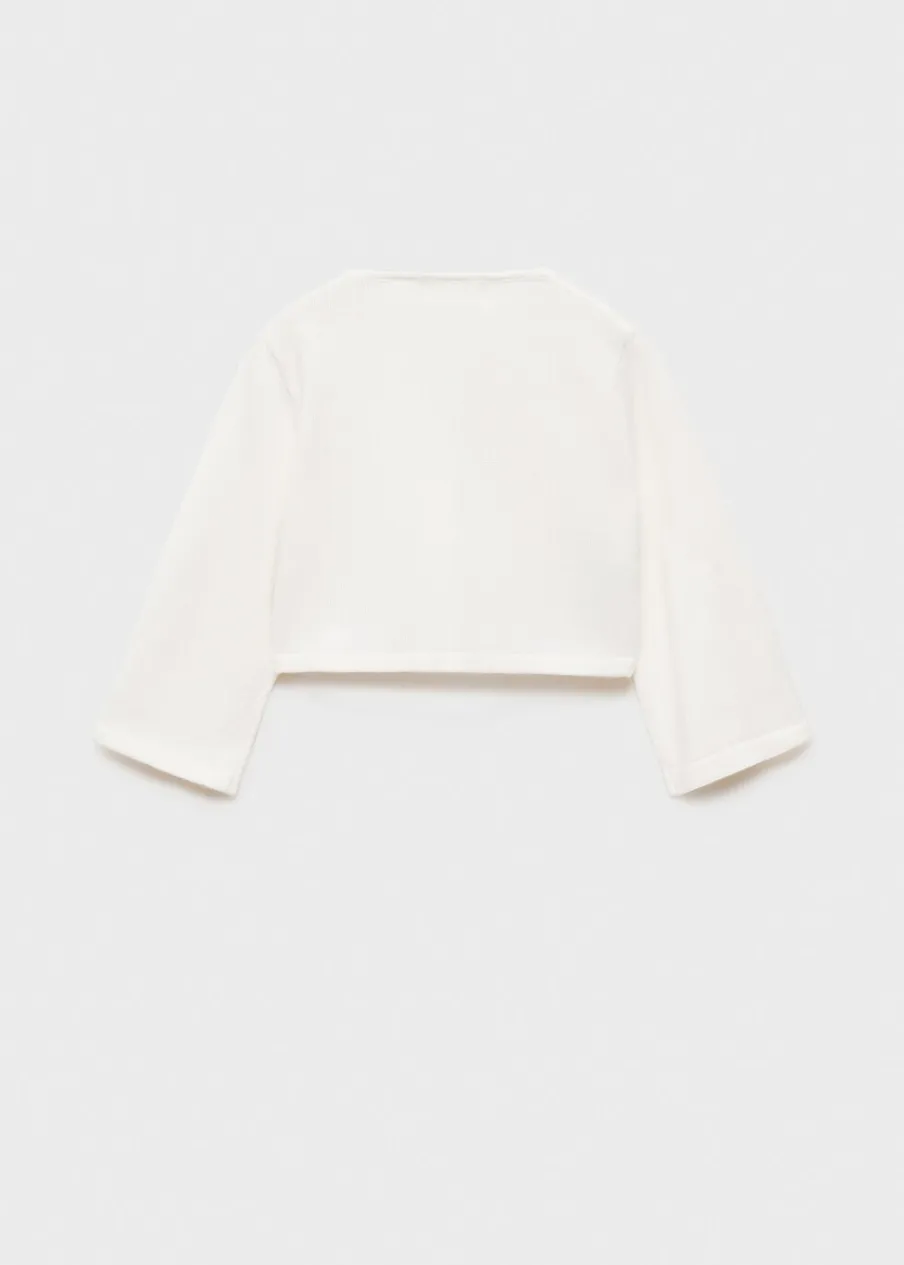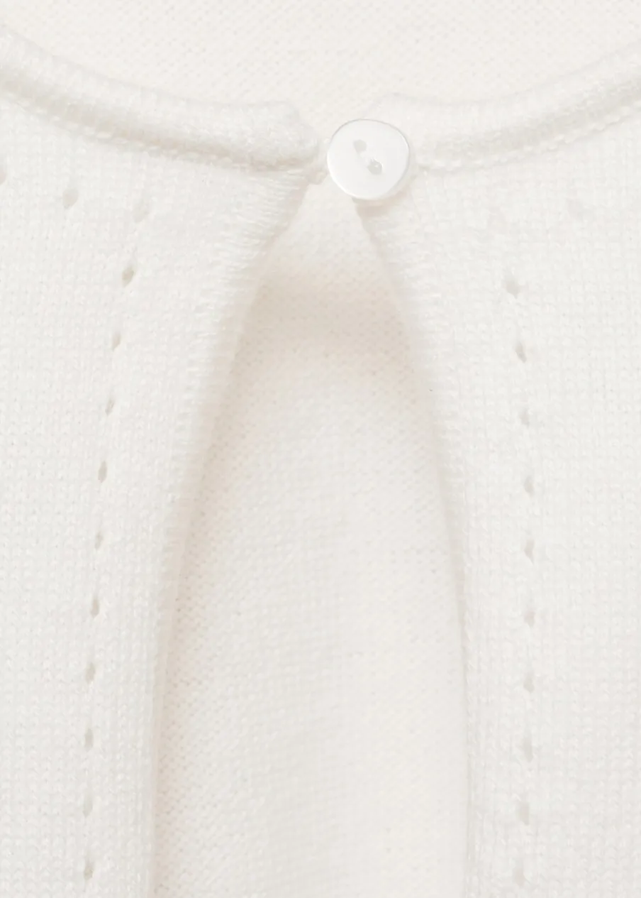 Bawełniana tkanina. Ażurowe detale. Okrągły dekolt. Długi, rozszerzany rękaw. Zapięcie na guzik z przodu.