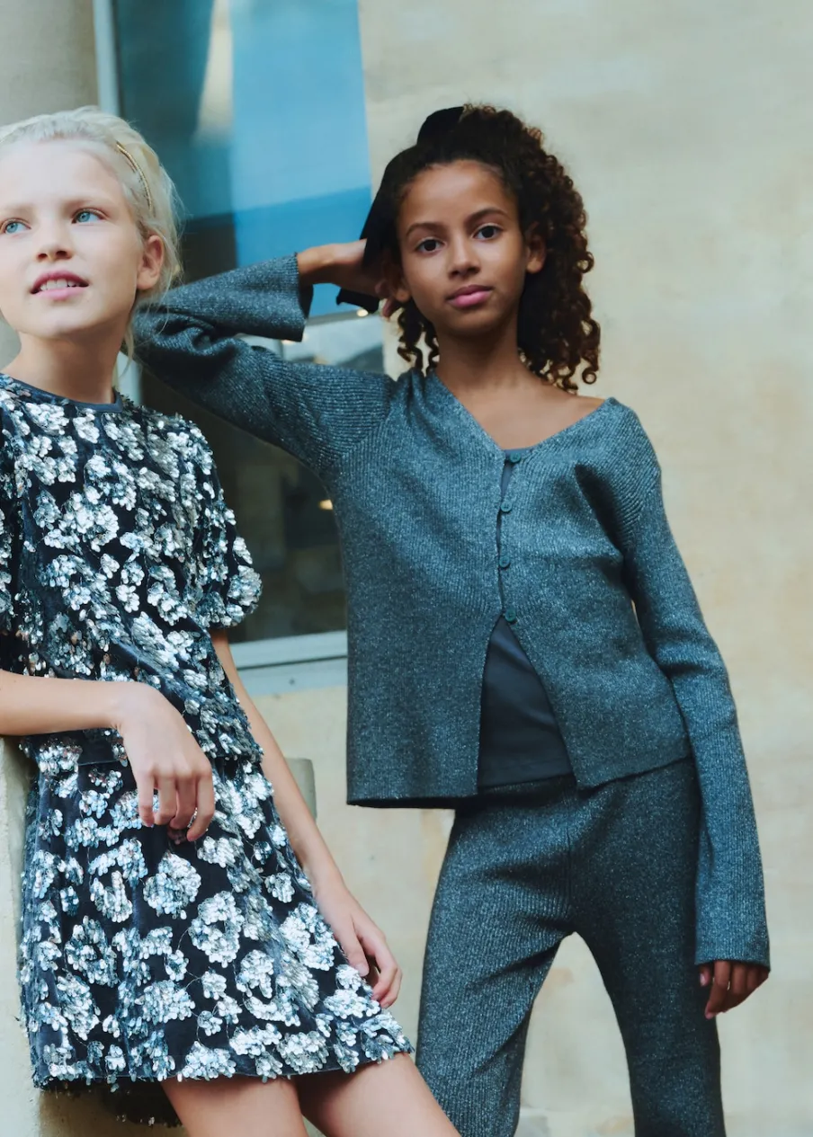 Metaliczna tkanina. Długi rękaw. Dekolt V. Zapięcie na guziki. Total look. Kolekcja wieczorowa i imprezowa.