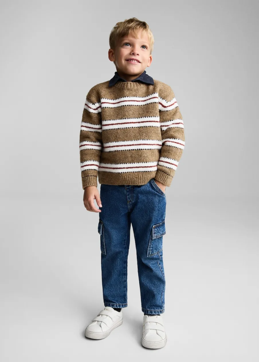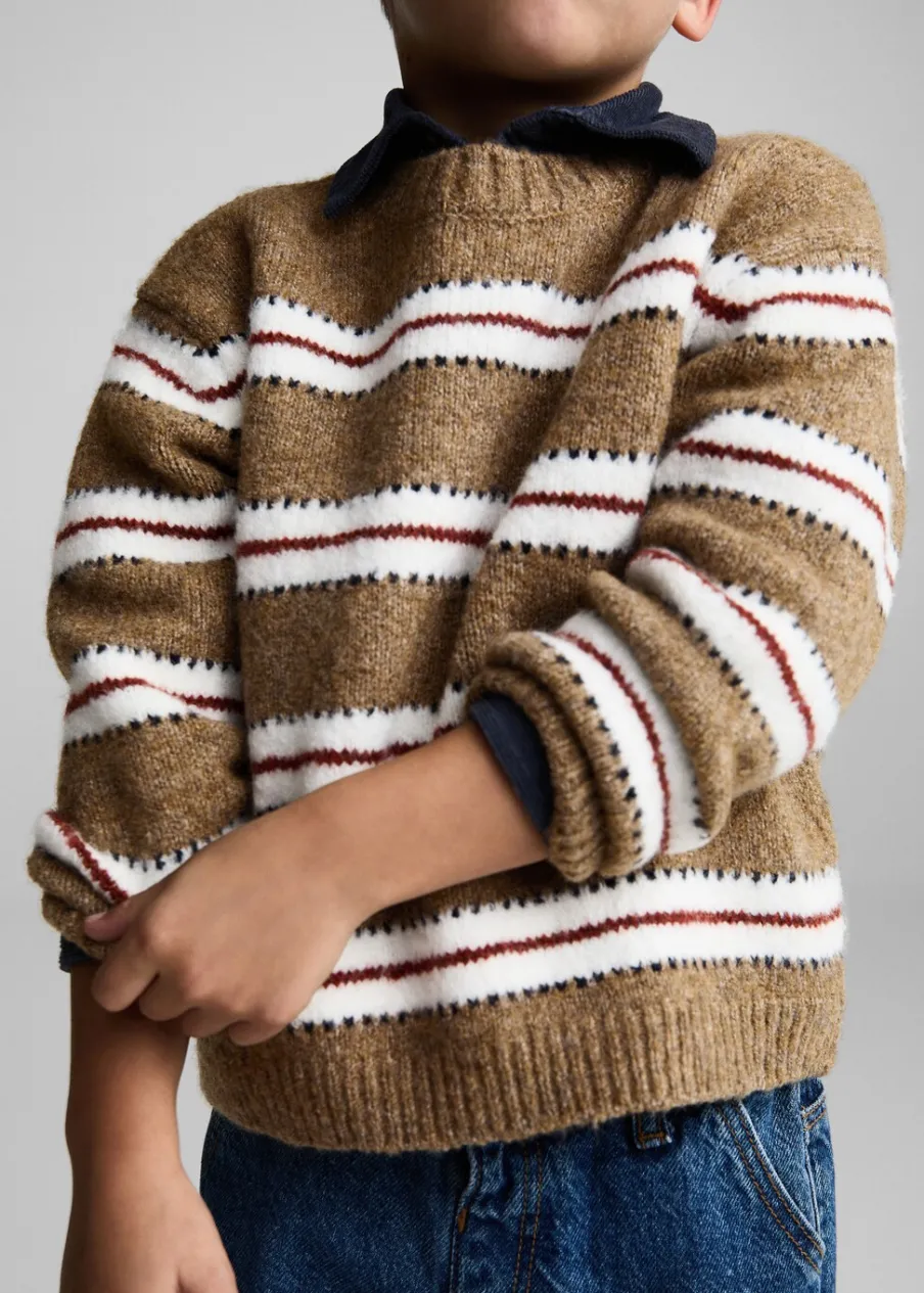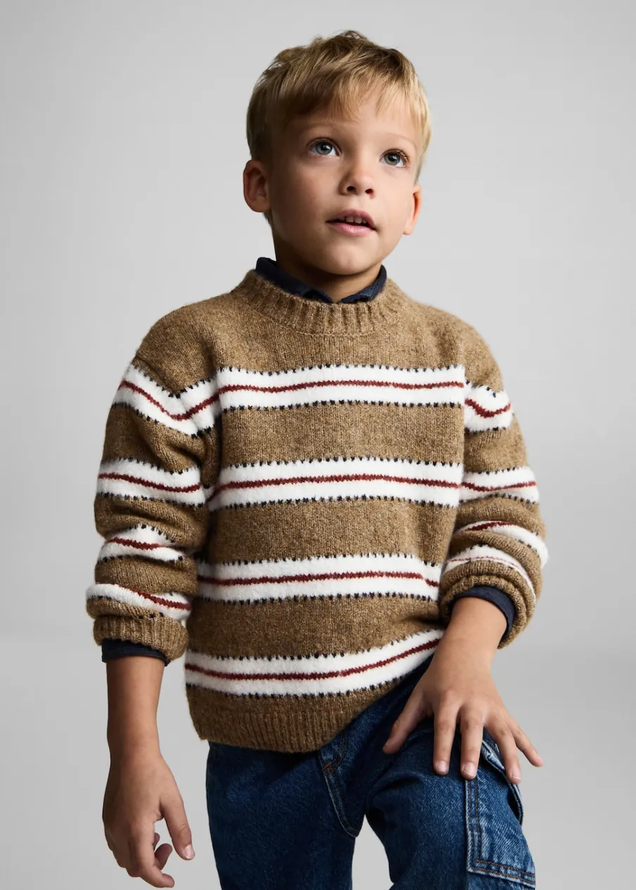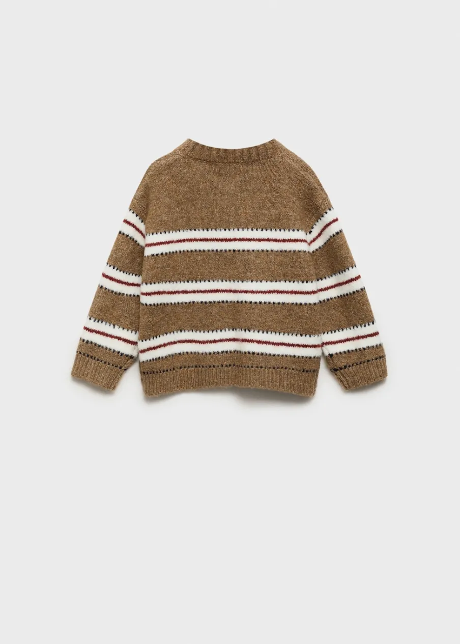 Dzianinowa tkanina. Model prosty. Wzór w paski. Okrągły dekolt. Długi rękaw. Bez zapięcia.