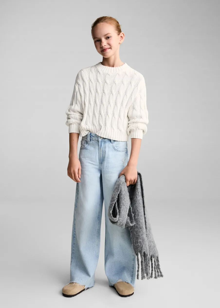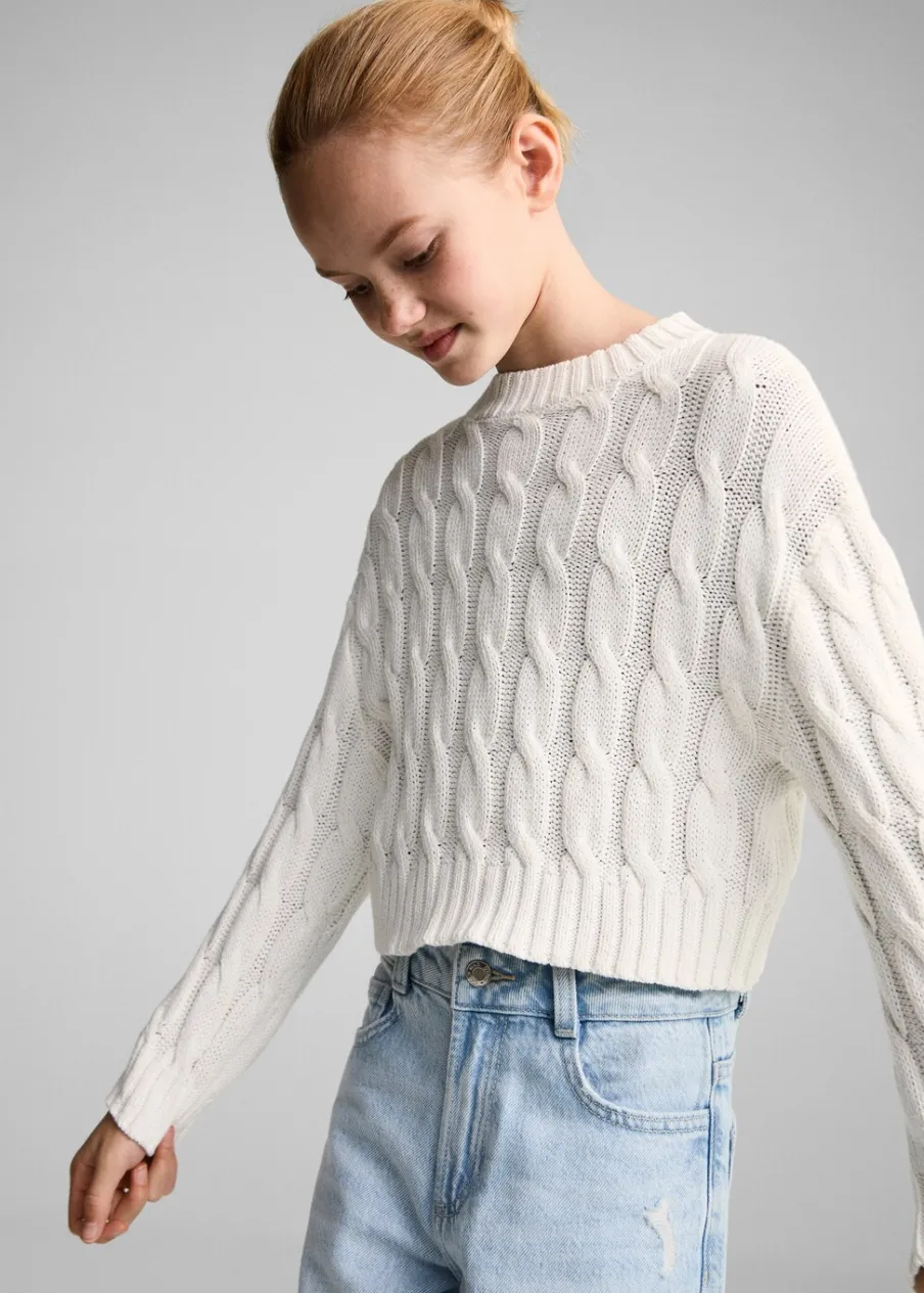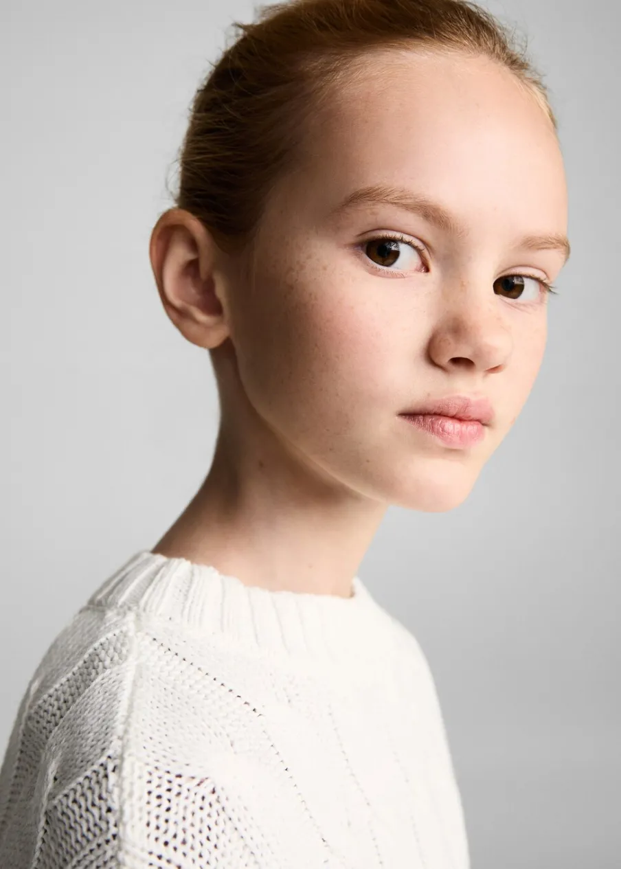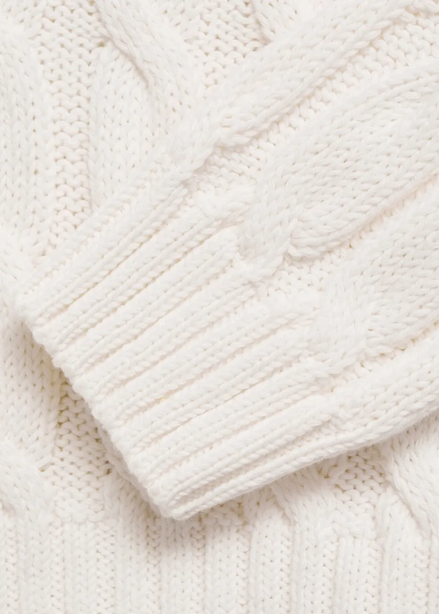 OpisTkanina z bawełną. Dzianina ze splotem warkoczowym. Model prosty. Okrągły dekolt. Długi rękaw.