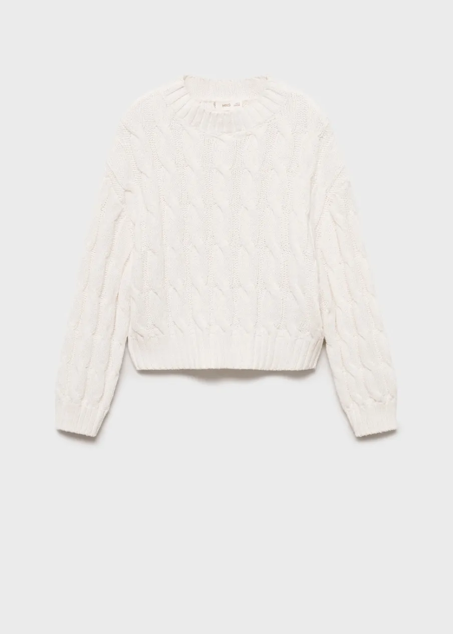 Tkanina z bawełną. Dzianina ze splotem warkoczowym. Model prosty. Okrągły dekolt. Długi rękaw.