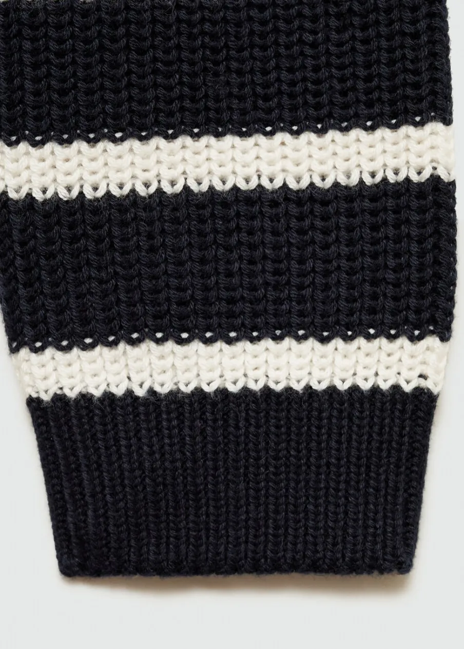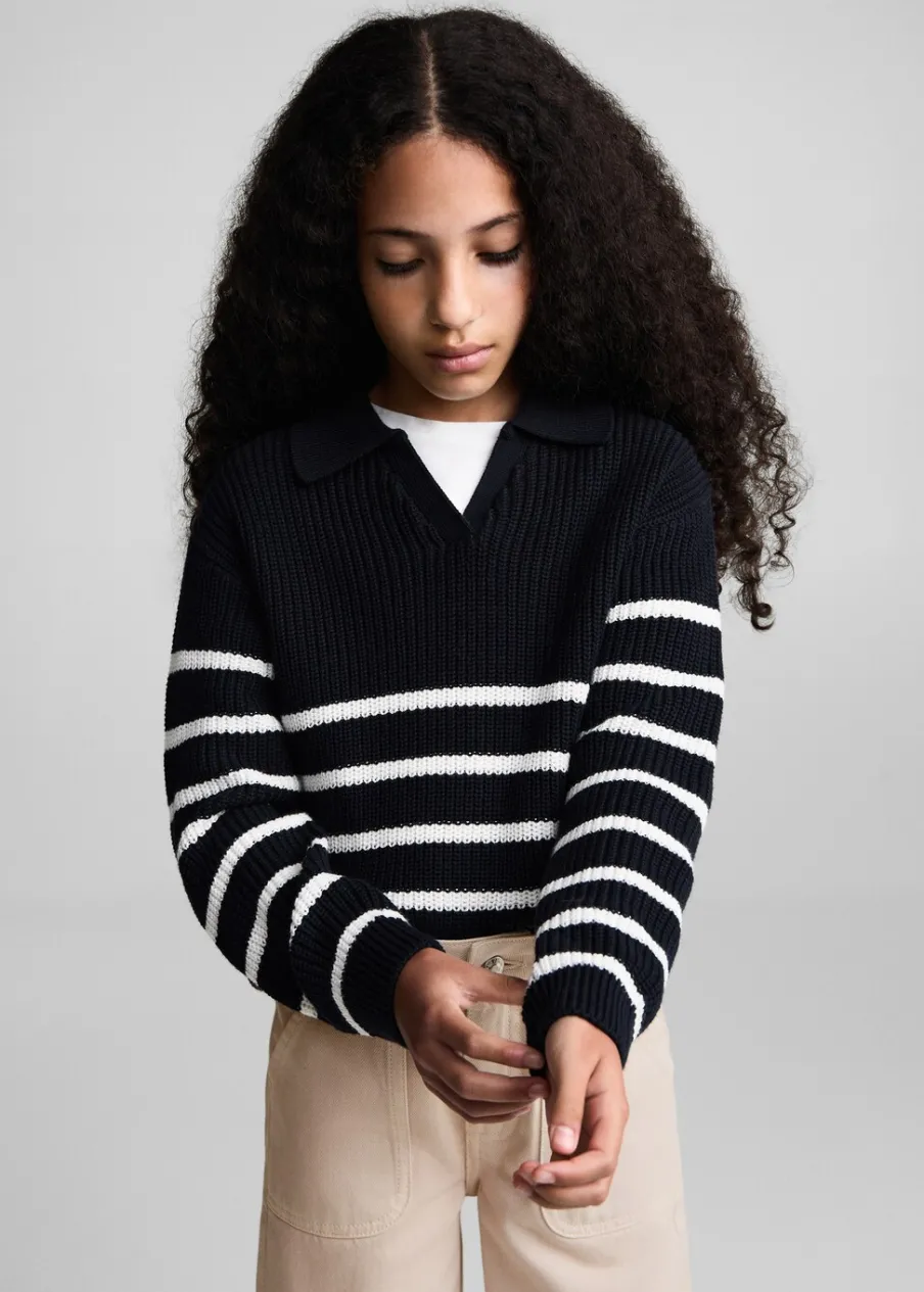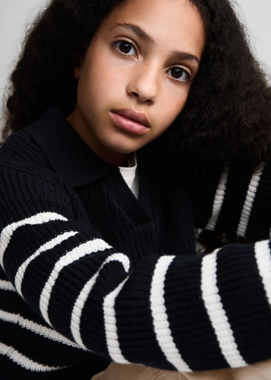 Dzianina. Tkanina z bawełną. Kołnierzyk polo. Bez zapięcia. Długi rękaw. Model prosty. Wzór w paski.